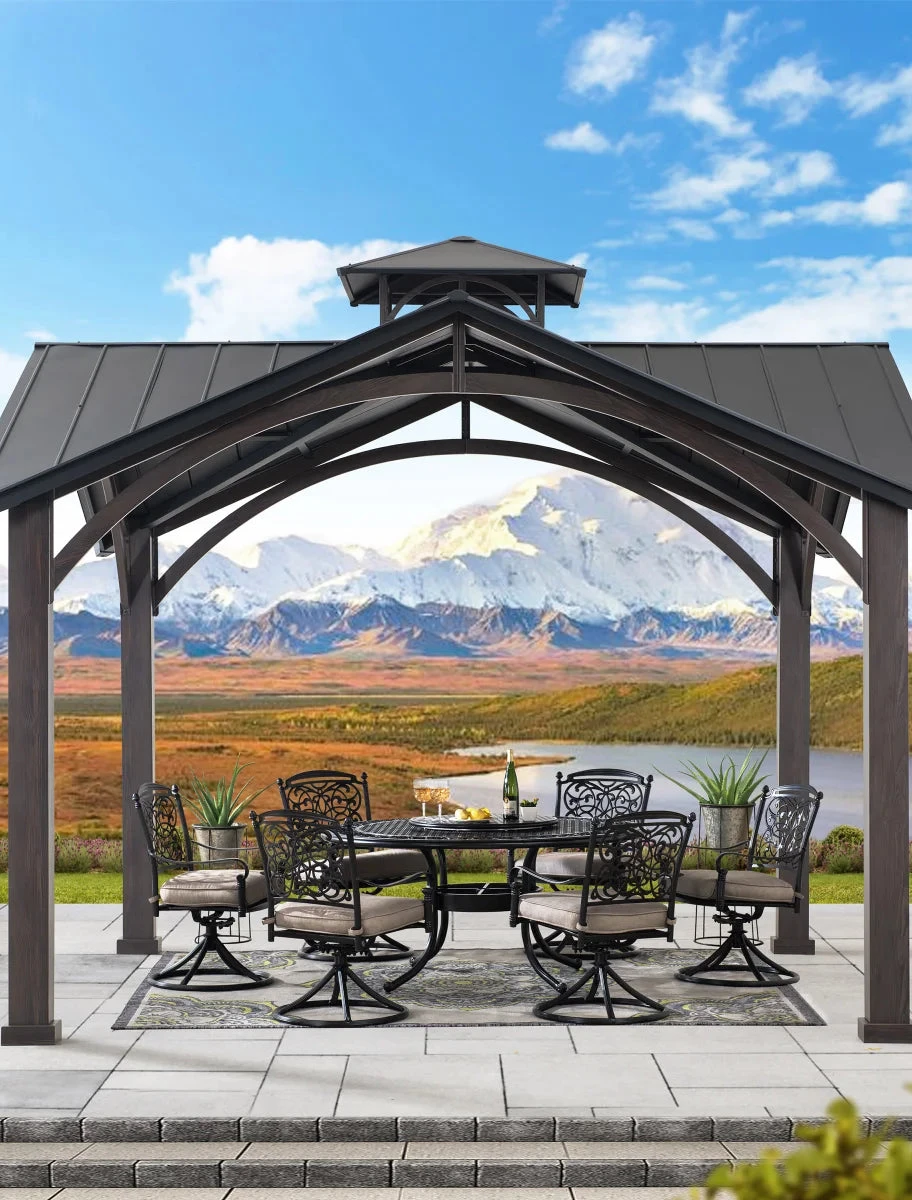 The timeless matte black weather-resistant powder-coated finish on the rust-proof aluminum roof will stand the test of time. The two-tier roof design provides just the right amount of airflow while keeping occasional inclement weather at bay. Enjoy the natural looking appearance of a rich dark brown wood frame constructed of rust-proof aluminum and rust-resistant galvanized steel. Set the mood by suspending a chandelier from the incorporated ceiling hook for functional light and high design. With straight-forward, easy-to-follow assembly instructions you will be relaxing with your beverage of choice in your favorite new outdoor living space for years to come.