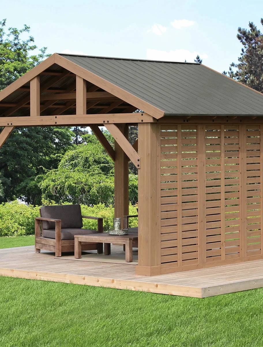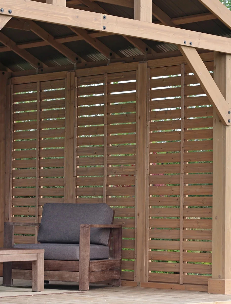 Yardistry's 12 ft. Pavilion Privacy Wall is the perfect complement to your existing Yardistry 14 x 12 Wood Pavilion with Aluminum Roof. Whether you’re looking for some shade, protection from the wind, or a little privacy, Yardistry’s unique privacy wall design has you covered. The Privacy Wall is built with 100% FSC Certified Outdoor Lumber and finished in a Mocha Brown stain to match your Yardistry Pavilion perfectly!