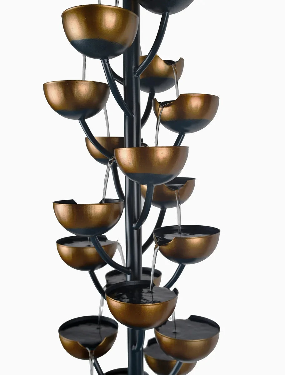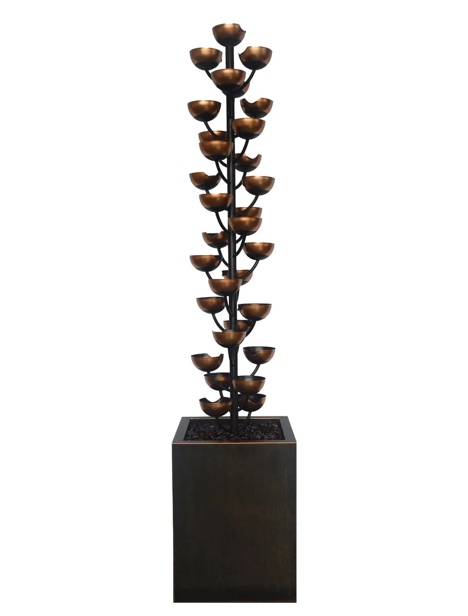 The Bloomington fountain creates an elegant focal point for your garden, porch, or patio. Dazzling at 5.4 feet tall, this fountain is sure to grab your attention as the gentle flow of water cascades down 31 cups into the glass bead-filled basin below. Constructed from steel with a rust resistant copper colored painted finish, the Bloomington Fountain will last for years to come. Some assembly required.