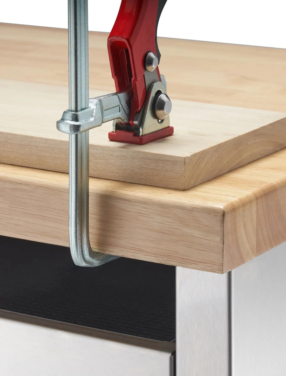 TRINITY PRO® 66" clampable rolling workbench with a 1.5" solid raised wood top enables easy access for attaching vices and securing your project. The bottom center drawer and the vertical pullout have 2 pairs of slides and hold 200 lb; all other drawers have single slides and 100 lb capacity. The heavy-duty fingerprint-resistant 18-gauge stainless steel construction ensures the strength and durability to handle the most challenging jobs.
