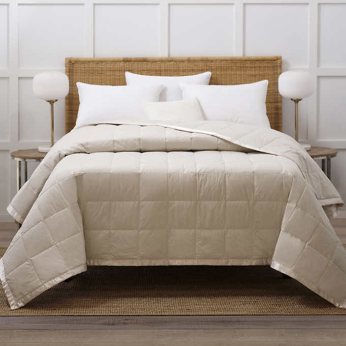 The 233 Thread Count 100% Cotton is soft to the touch and the Down Proof fabrication ensures fill will remain inside the blanket. A shimmering satin binding adds just the right amount of contemporary style. Bundle up on the couch and watch your favorite show with a luxurious down filled blanket tonight.