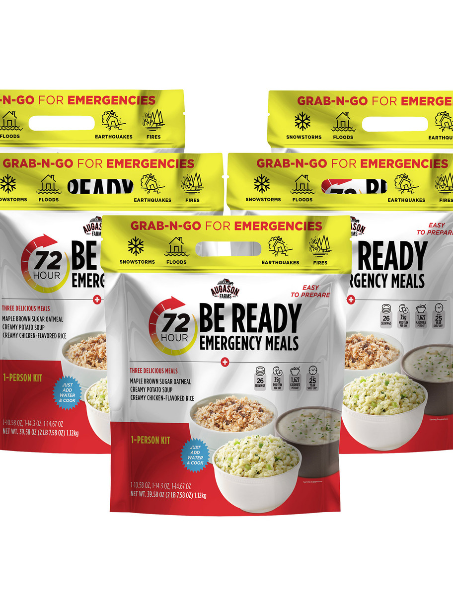 Augason Farms BE READY Emergency Meal kits are designed for affordability and convenience so you can be prepared in every location you spend time. Places like home, workplace, automobile, RV, cabin, boat, and second home are critical locations for emergency preparedness. And don’t forget to prepare your college student (and give yourself one less thing to worry about) by sending him or her off to school with BE READY kits for their vehicle and dorm room.