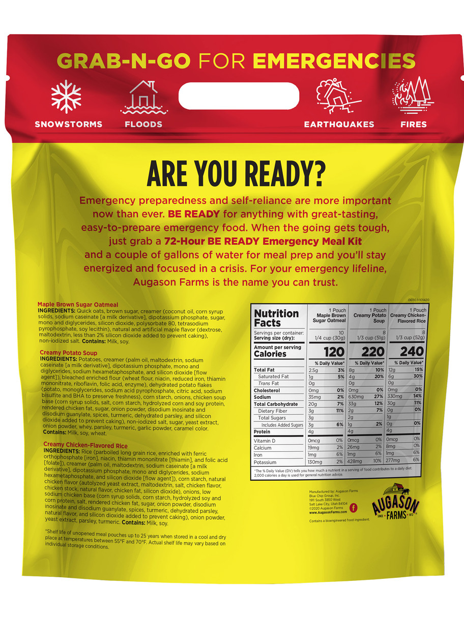 Are you prepared with enough food to get through a crisis? For most Americans, the answer is no. But when downed power lines, road damage, flooding, or winter whiteouts happen (to name a few), it can be difficult for emergency crews to reach you, especially in the first three or four days of an emergency. Augason Farms new BE READY Emergency Meal kits take the gamble out of you and your family’s safety and will help you BE READY for anything that comes your way.