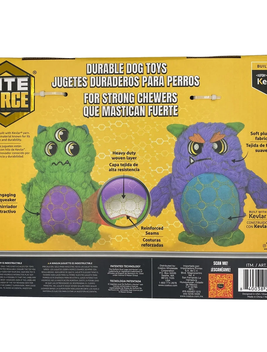 The Bite Force Built with Kevlar™ Tough Plush 2 Pack Monster Dog Toy is the paw-fect toy for your toughest chewer. Designed and constructed with a patented multi-layer design and reinforced with Kevlar yarn for superior durability and strength, this is a fantastic toy. It’s not only tough enough to stand up to even the most intense play sessions, but it’s also incredibly soft and cuddly, providing your furry friend with a comforting and satisfying chewing experience!!