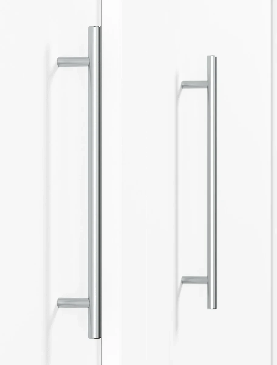 - Shaker-inspired trim and metal handles for transitional styling