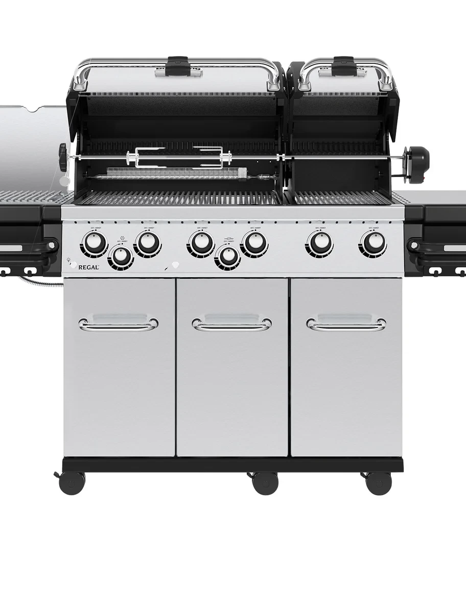 Become the ultimate backyard chef with the Broil King Regal S 690 PRO IR gas grill. With its unique twin head design, this grill provides you with the versatility of 2 completely independent cooking surfaces to do more with your grill. Cook the perfect steaks in the large head while finishing off savory seafood in the smaller section for a delicious surf-and-turf meal; rotisserie cook juicy chickens while grilling up tender vegetables for a great side dish; use the entire grill to create a backyard feast for the entire neighborhood or cook a couple of burgers in the small grill head - this grill gives you the ability to do it all. Kick things up a notch with the infrared side burner that can quickly heat up to 1,700°F allowing you to rapidly sear your meat, locking in juices and creating unmistakable flavor. Additional features include rear rotisserie burner, premium rotisserie kit, solid 9 mm stainless steel cooking grates (large head) and reversible heavy-duty cast iron cooking grates (small head), stainless steel side shelves with cast aluminum condiment bins and integrated tool hooks. Vibrant blue LED lights in the control knobs provide a casual elegance when grilling at night. Stainless steel cook box construction with solid cast aluminum end caps ensure fantastic heat retention and durability.