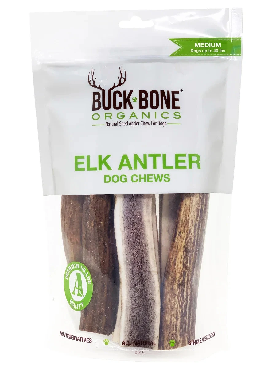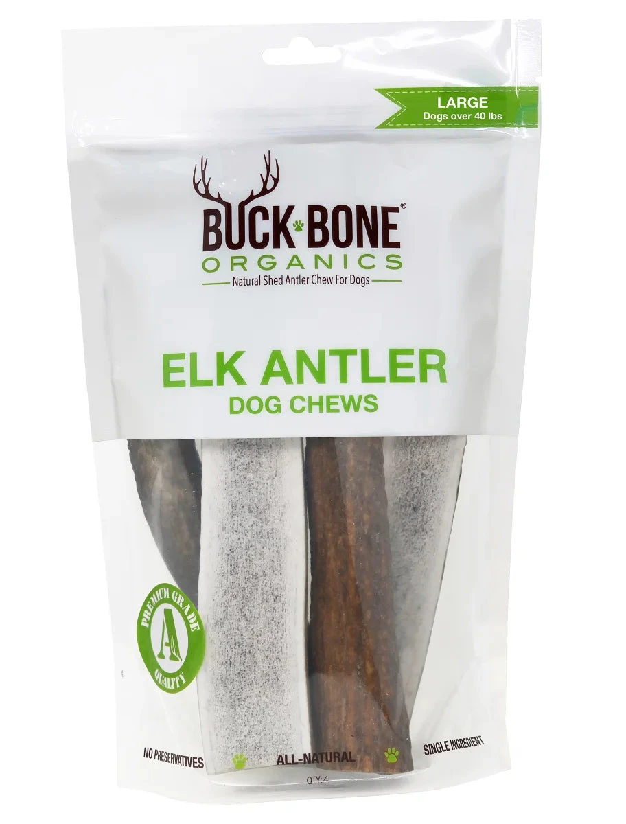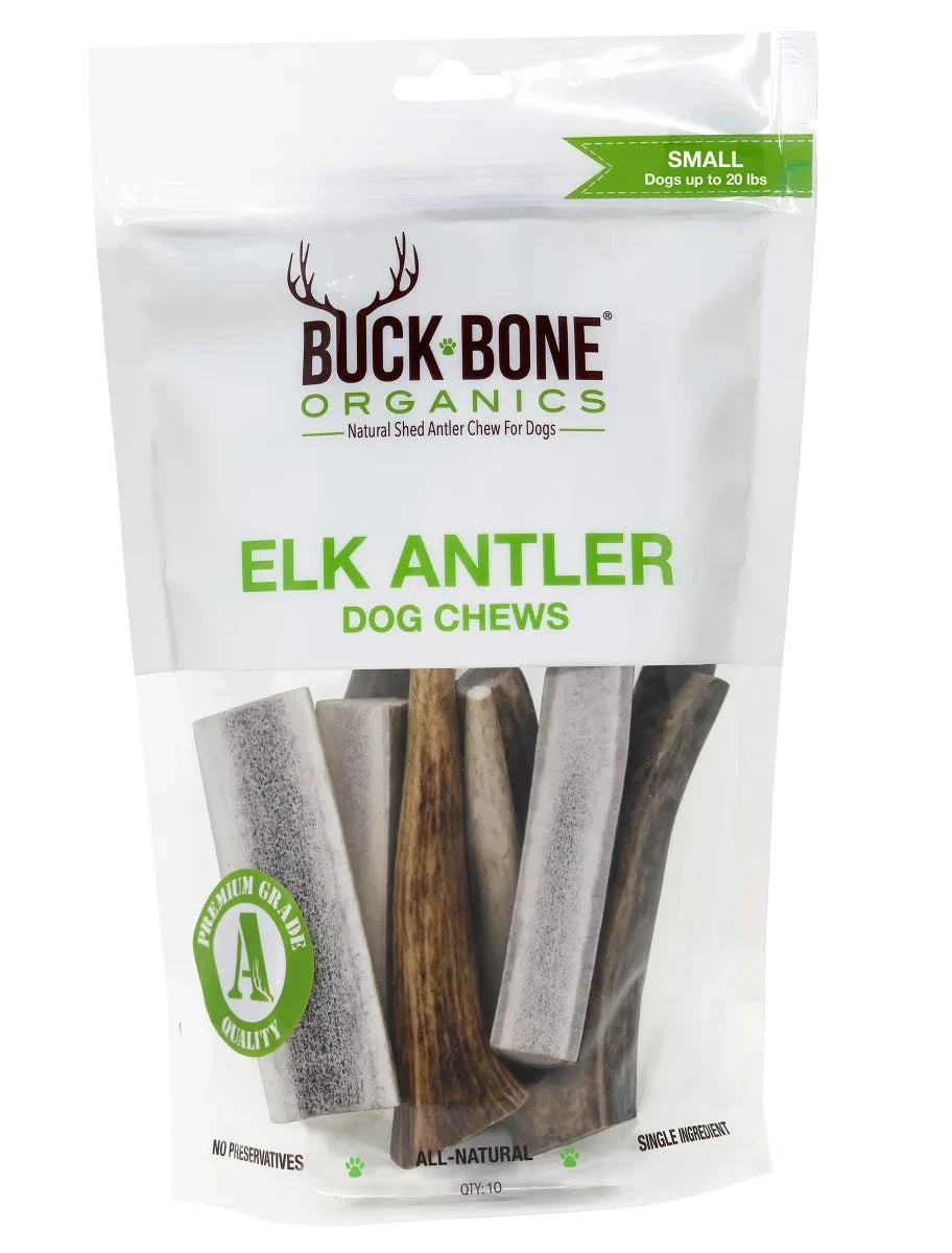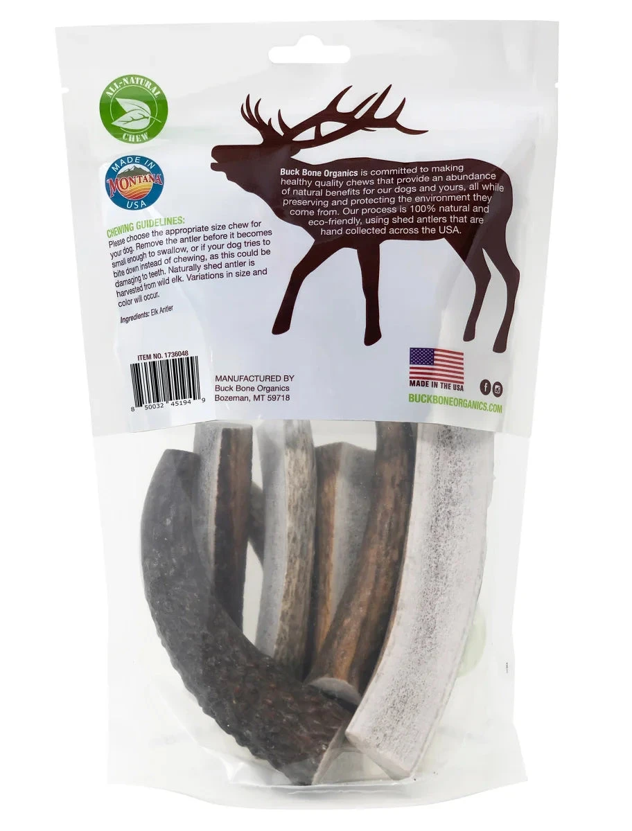 Buck Bone Organics Natural Shed Elk Antler Dog Chews. Please select either Small, Medium or Large according to your dog's breed size.