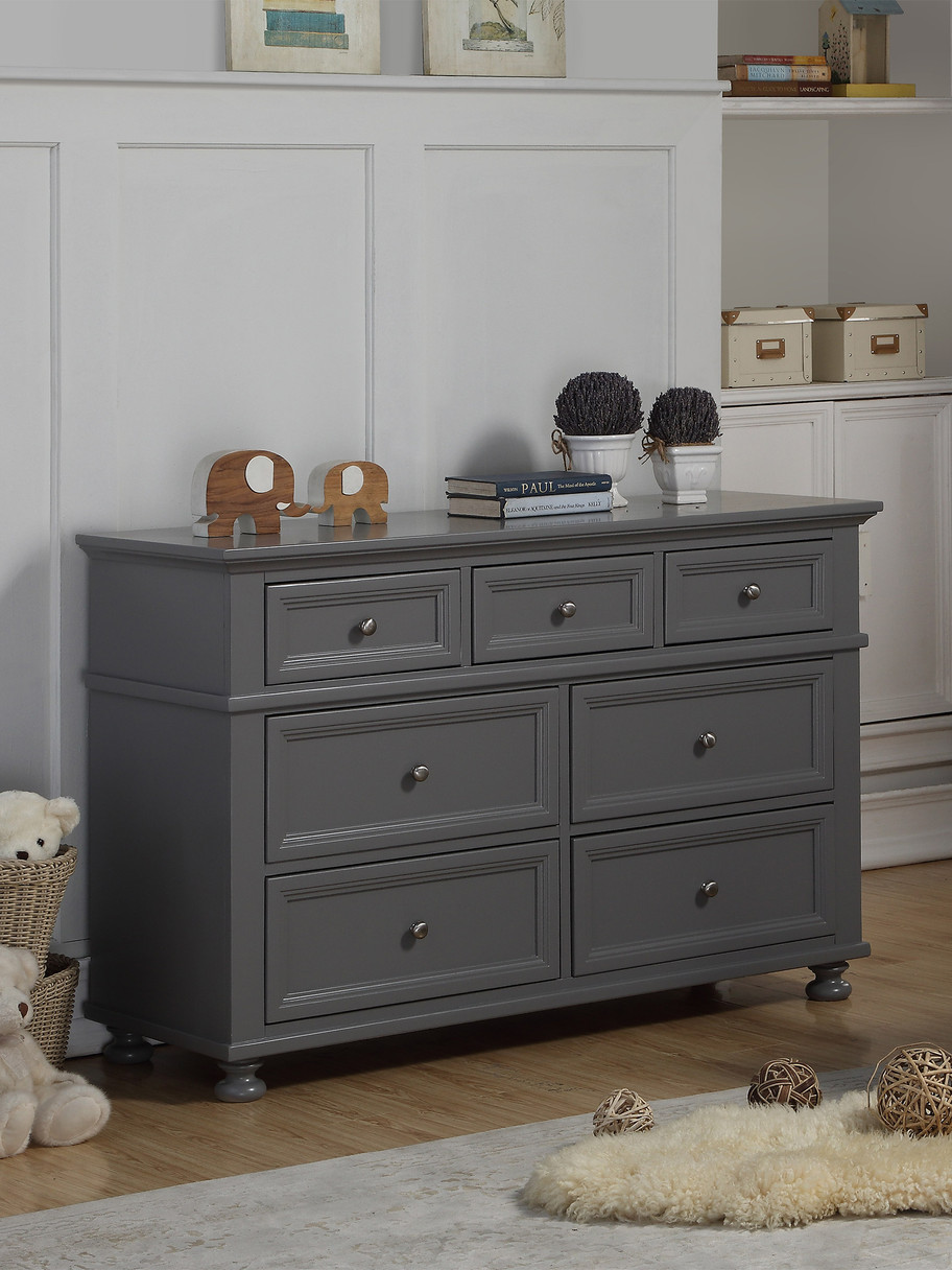 The Carlie Nursery Collection offers a modern contemporary look and design. The lovely Pebble Gray finish is clean and timeless, making it perfect for a boy or a girl. This collection will see your baby all the way through their childhood and into their teenage years. The crib converts to a toddler bed (rail included), a daybed, and a double bed (extension kit included). A graceful arch highlights the elegant crib. This collection is made from solid New Zealand Pine in a lovely Pebble Gray finish. The 7-drawer double dresser includes brush nickel accents on drawers, full extension glides, and dovetail joints on drawers which are added features that will make the furniture last for many years.