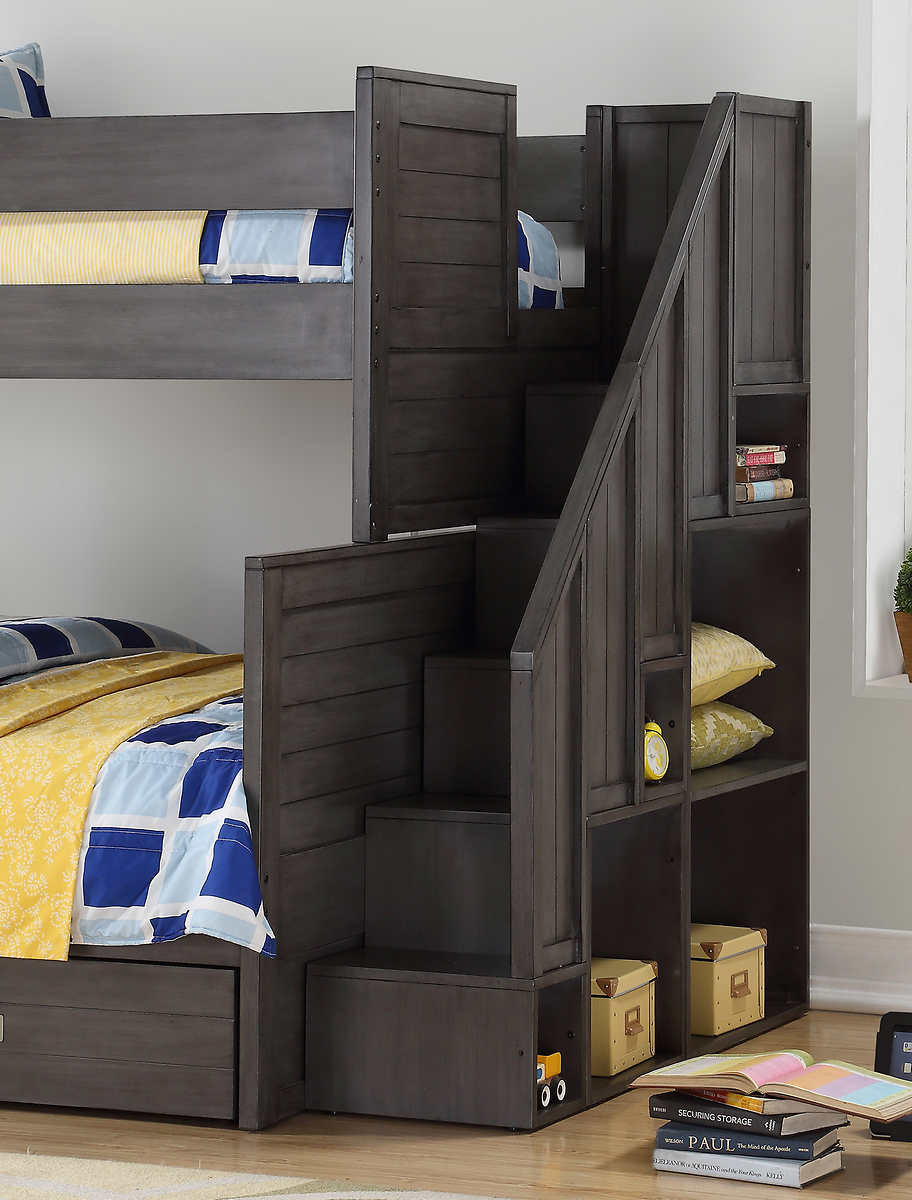 The Dylan are a Twin over full Bunk Beds with stairs that feature 6 open-concept bookshelves on the end and are the ideal choice for parents wanting a bunk bed that has a modern contemporary flare, but manages to retain a classic look and feel that complements their child’s room no matter its style or aesthetic for years to come. Offered in a Gray Slate finish the Dylan bunk bed are perfectly suitable for either a boys’ or girl’s room. The staircase and bookshelves are constructed to be universal for positioning on either side of the bunk bed.