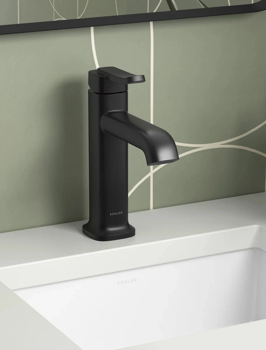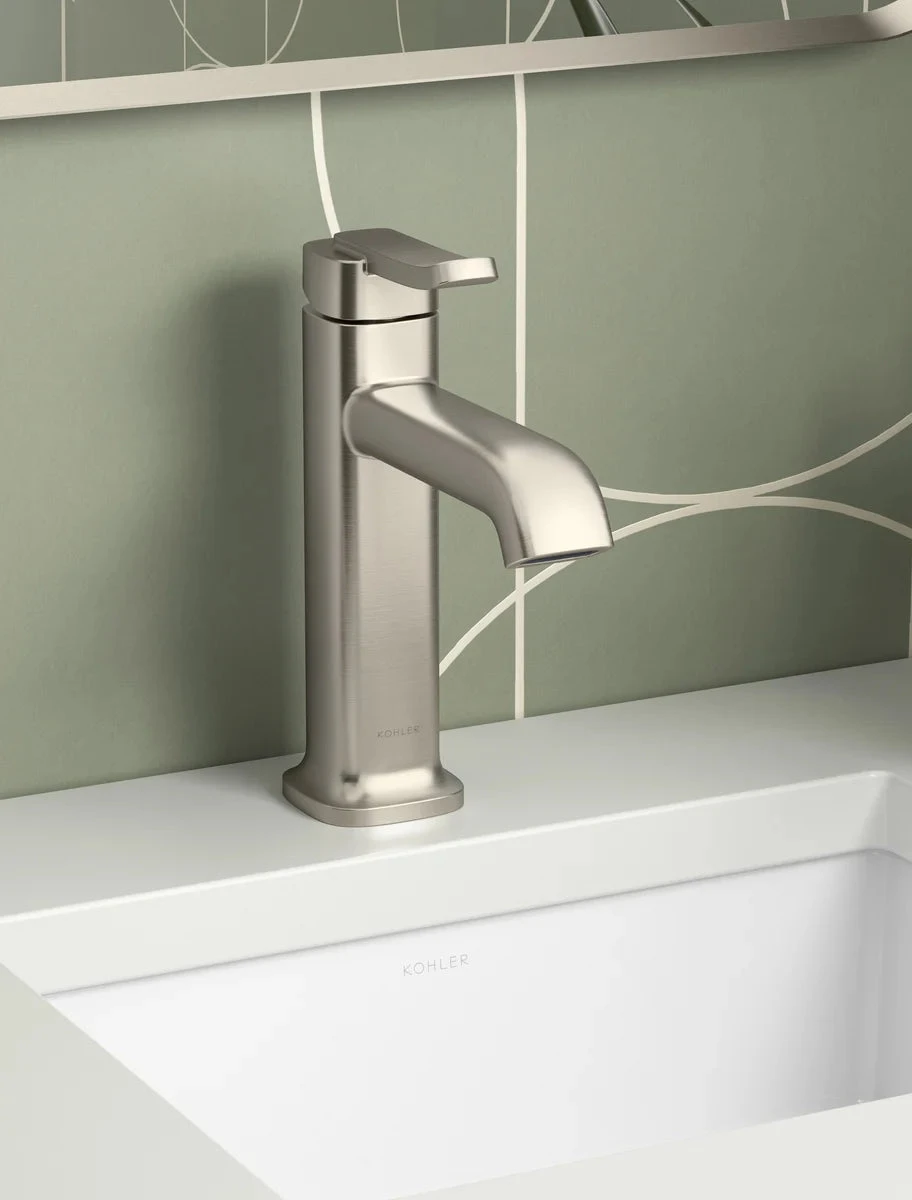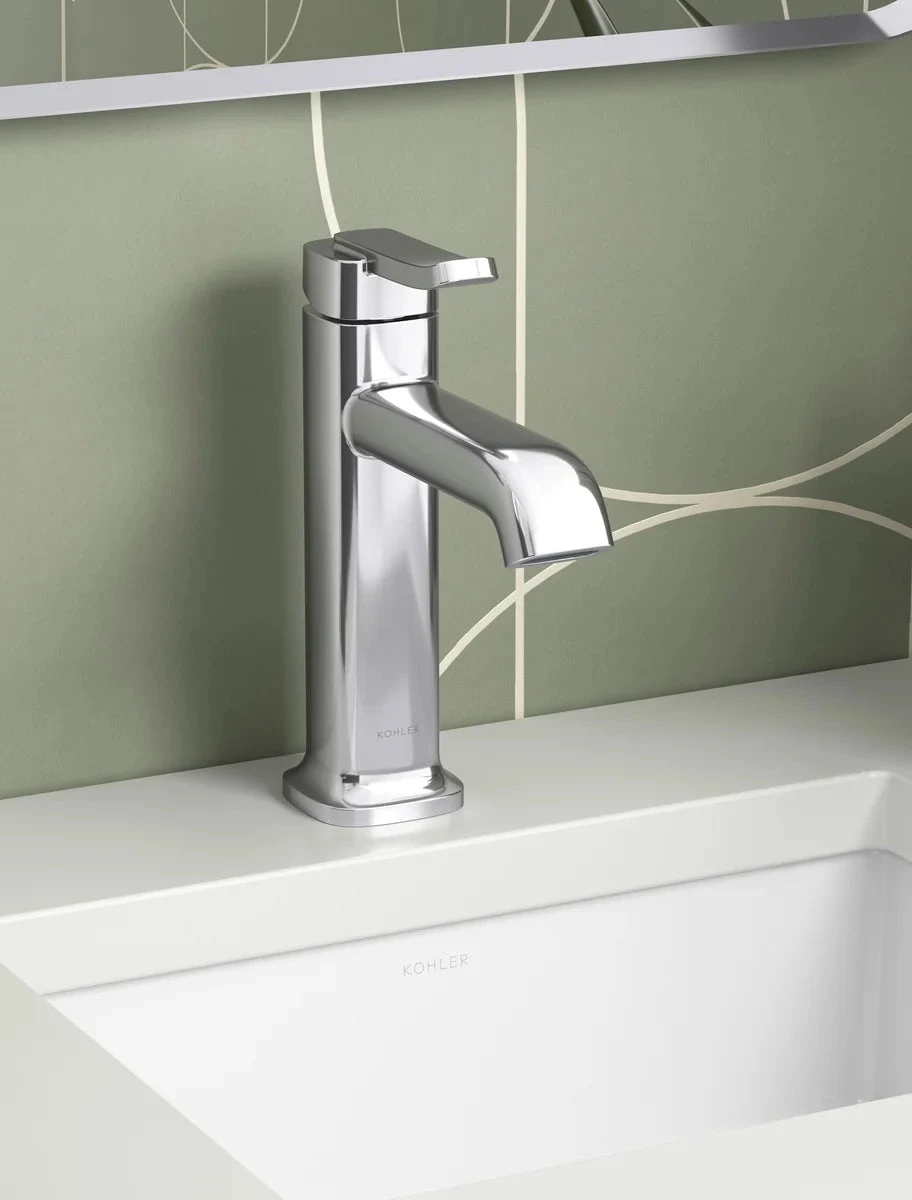 A sophisticated stacking detail and softened square profile give the Cordate bathroom faucet collection a clean, modern look. The single-handle bathroom sink faucet has a slight bending at the handle tip and a contoured spout. The blended base detail completes the comfortable aesthetic.