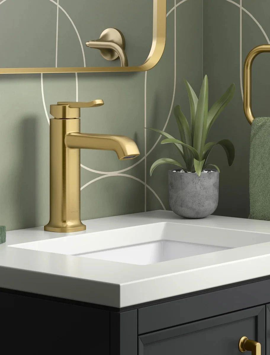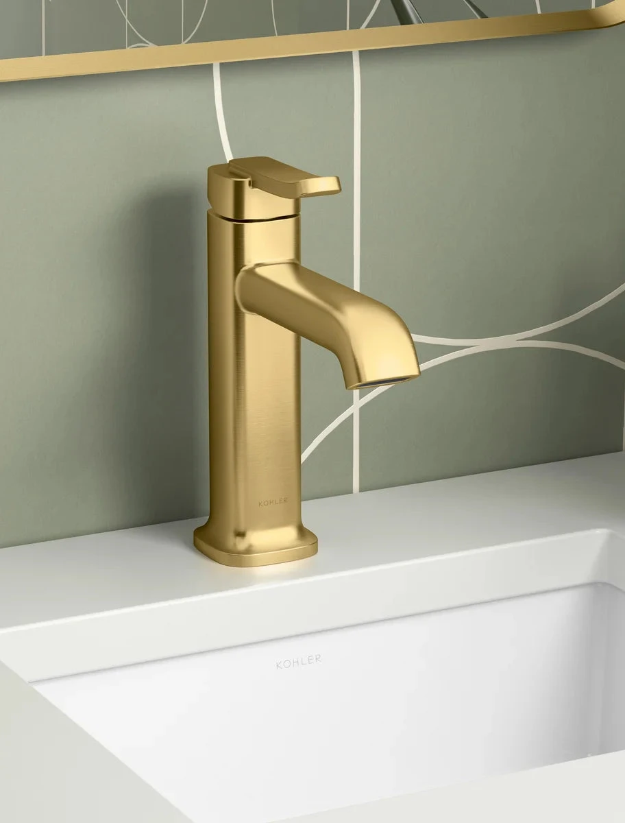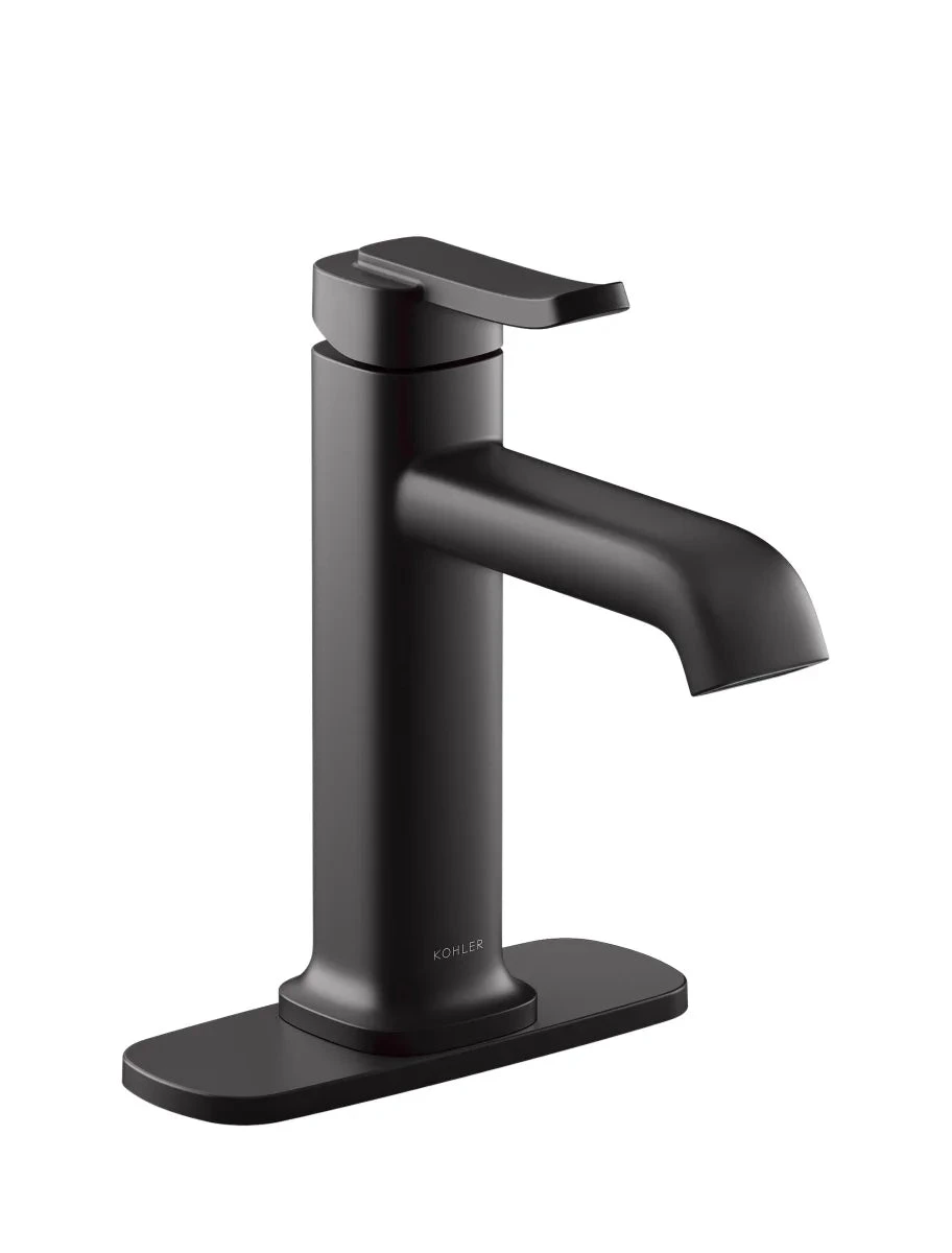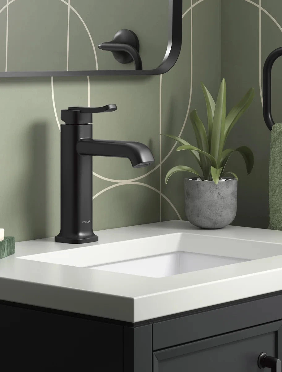 A sophisticated stacking detail and softened square profile give the Cordate bathroom faucet collection a clean, modern look. The single-handle bathroom sink faucet has a slight bending at the handle tip and a contoured spout. The blended base detail completes the comfortable aesthetic.