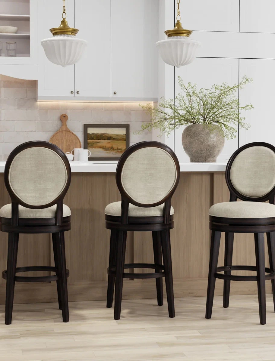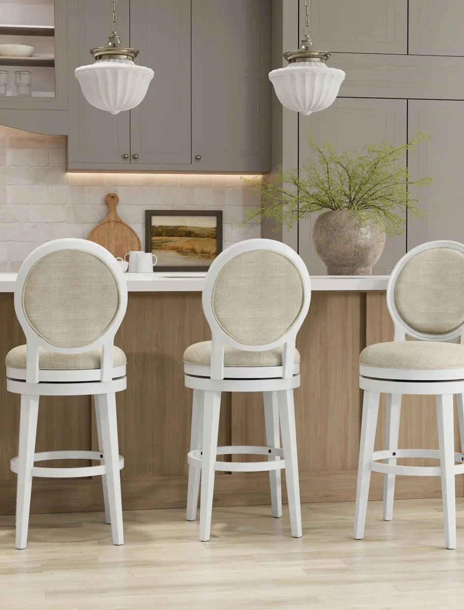 The Dayton Swivel Bar Height Stool delivers a quiet strength that will help to ground your space, gracefully. Crafted with soft, classic lines in a beautiful dark brown or white finish, this traditional-meets-farmhouse stool features a 360-degree swivel seat upholstered in neutral Beige fabric. The round back design is inlaid with matching upholstery on both the front and back for visual appeal from every angle. Find the perfect place to make new memories with the people you love. Assembly required.