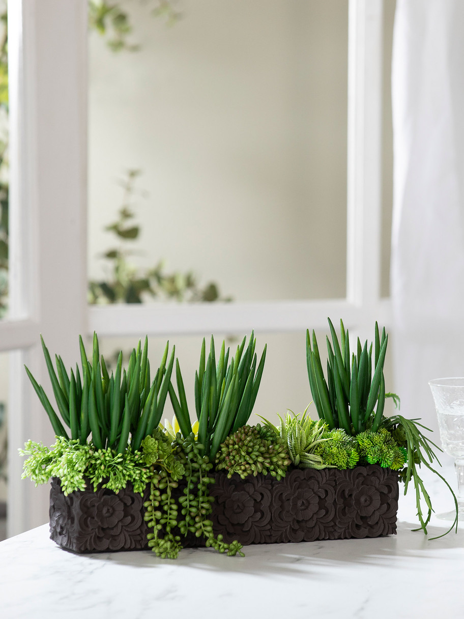 Add the look of organic greenery to any tablespace with this designer arrangement of realistic Agave, Senecio, and hanging cactus potted in an intricately etched cement planter.
