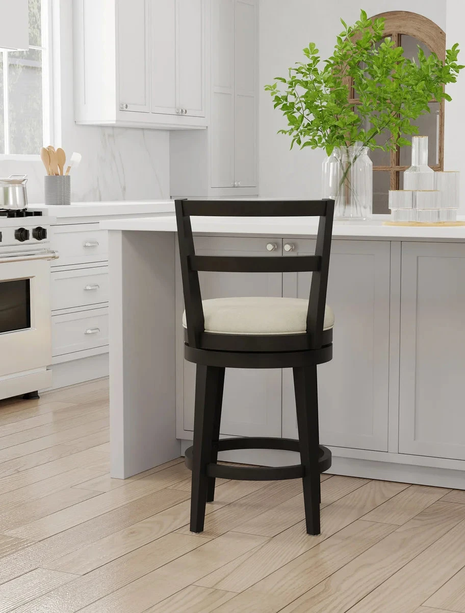 This transitional counter stool will anchor your space with its carefully crafted, tapered lines. The stability of the strong, black silhouette is offset by the simplicity of its single ladder-back design. The 360-degree swivel seat is upholstered in a neutral Ivory fabric which, when offset by the black wood, results in a versatile tuxedo aesthetic. Assembly required.