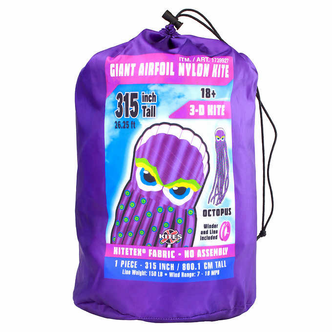 This Giant Octopus Airfoil Nylon 3-D Kite is designed to resemble a giant octopus. This vibrant and colorful kite features 8 playful tentacles, making it look striking and eye-catching when it's flying in the sky. This kite is made from a shiny durable nylon material and is known for its stability and ability to fly smoothly.