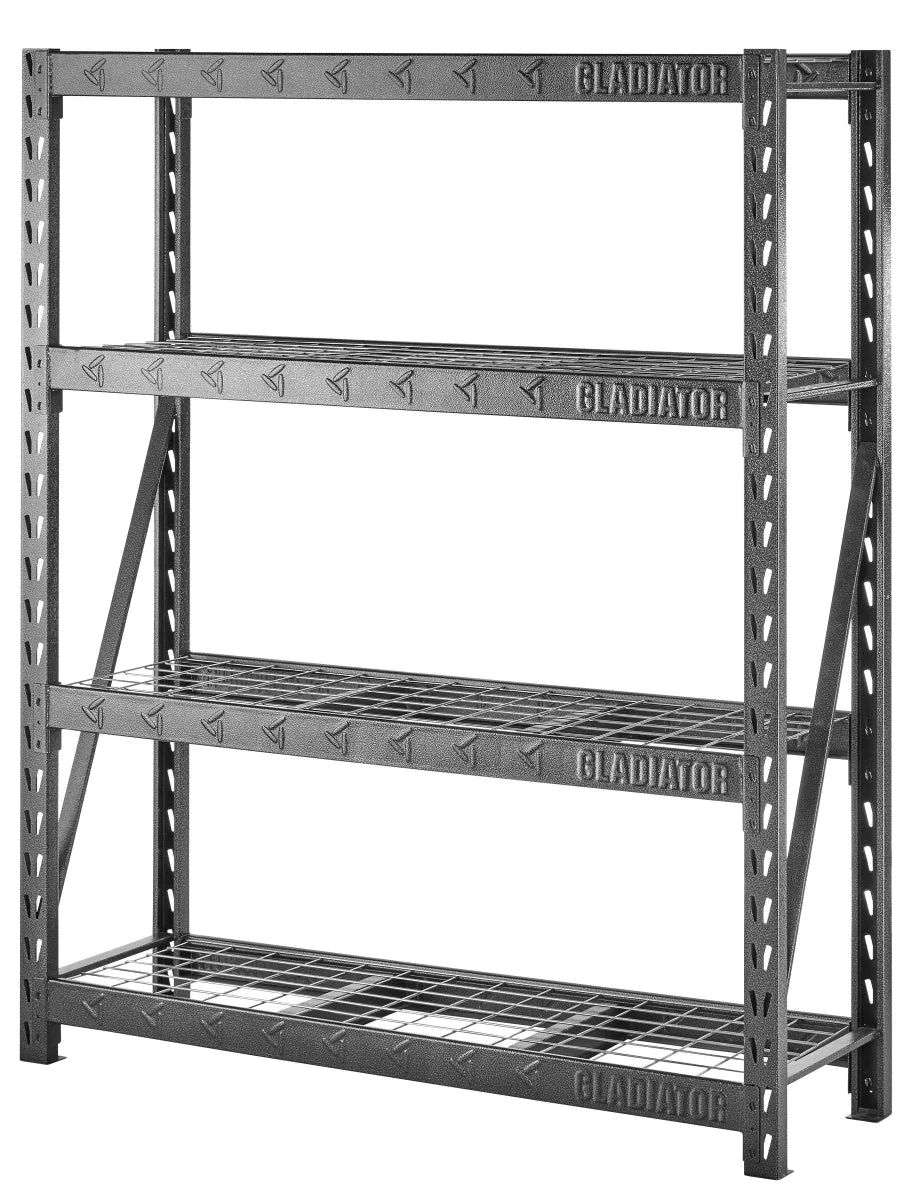 Store large and bulky items on the Gladiator® Rack Shelving unit. This storage unit is fast and easy to assemble at home, and does not require tools. The welded steel frame features four metal shelves that can support up to 2,000 lbs each, and the dual slot profile allows for additional supports and shelves. Also available in 48" wide x 18" deep and 77" wide x 24" deep configurations.