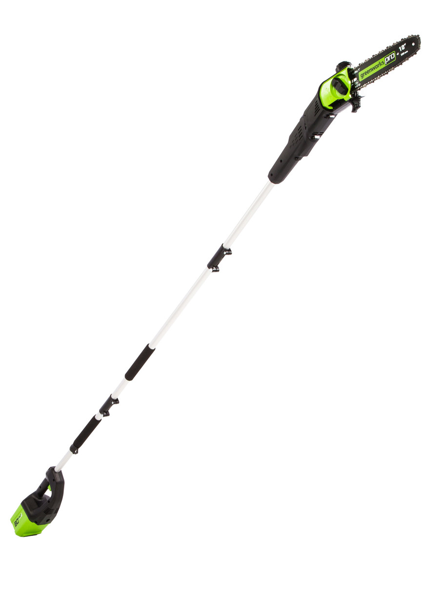 The powerful Greenworks 80V cordless battery platform gives you all the power you need to tackle all your lawn care projects. Greenworks Pole Saw and Pole hedge Trimmer combo features a 10” pole saw and a 20” laser steel hedge trimmer. This is the perfect tool or yard clean up, storm clean up and general pruning & limbing when extended reach is needed.