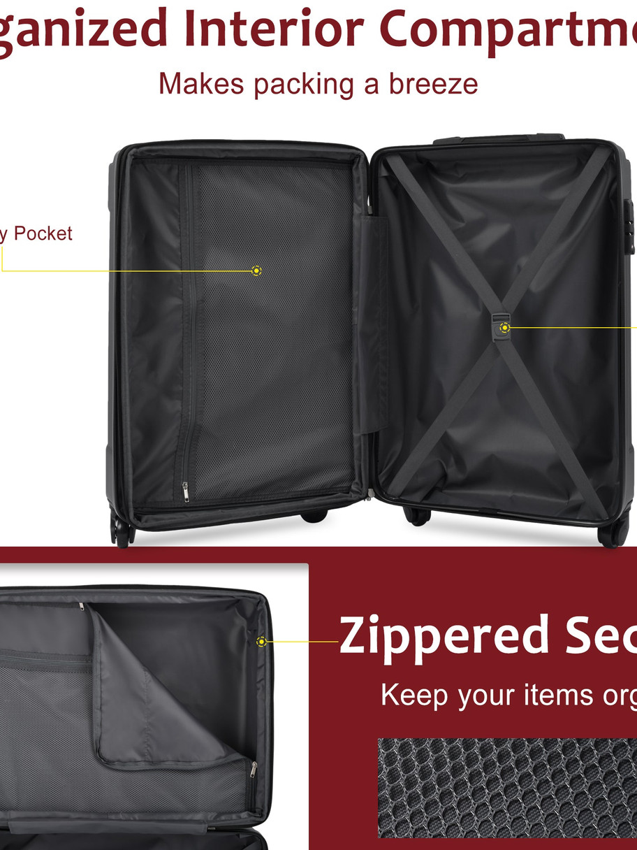 ABS Hard Shell: The material has excellent wear resistance and impact resistance, and is lightweight. Durable luggage can withstand transportation and keep your belongings safe. Lightweight luggage makes traveling effortless and enjoyable.