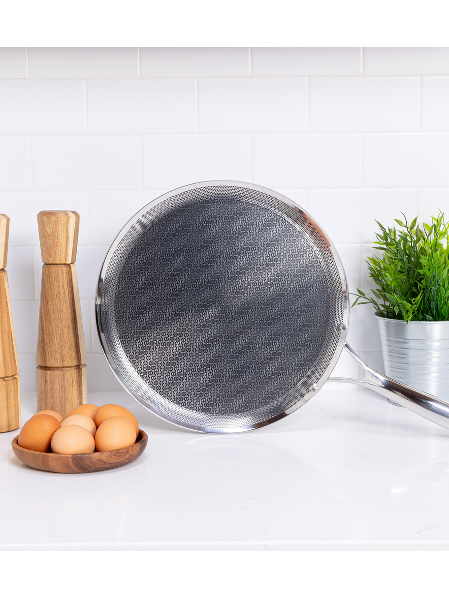 - HexClad Cookware features a tri-ply construction of high quality aluminum between two layers of stainless steel laser-etched with our patented hexagonal non-stick surface to provide the ideal hybrid cooking performance and heat distribution.