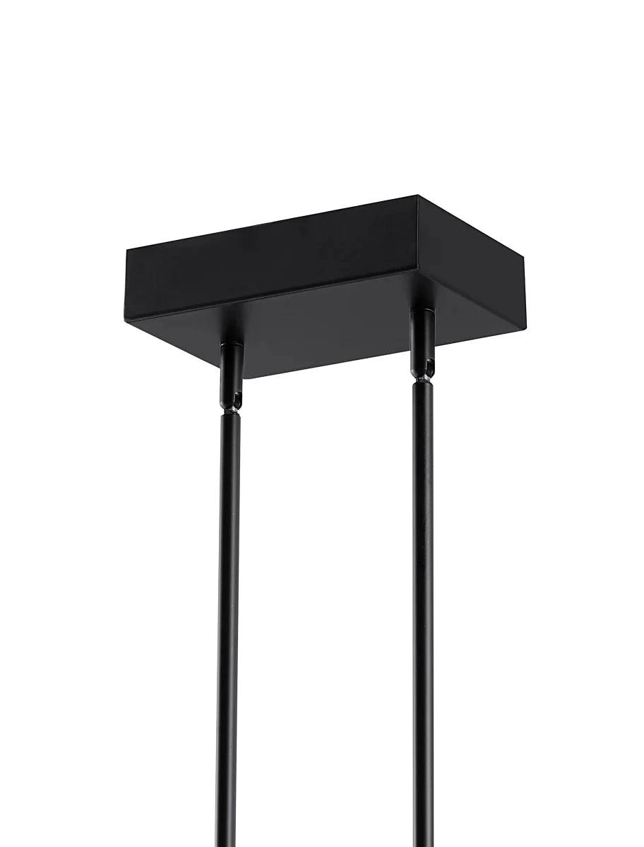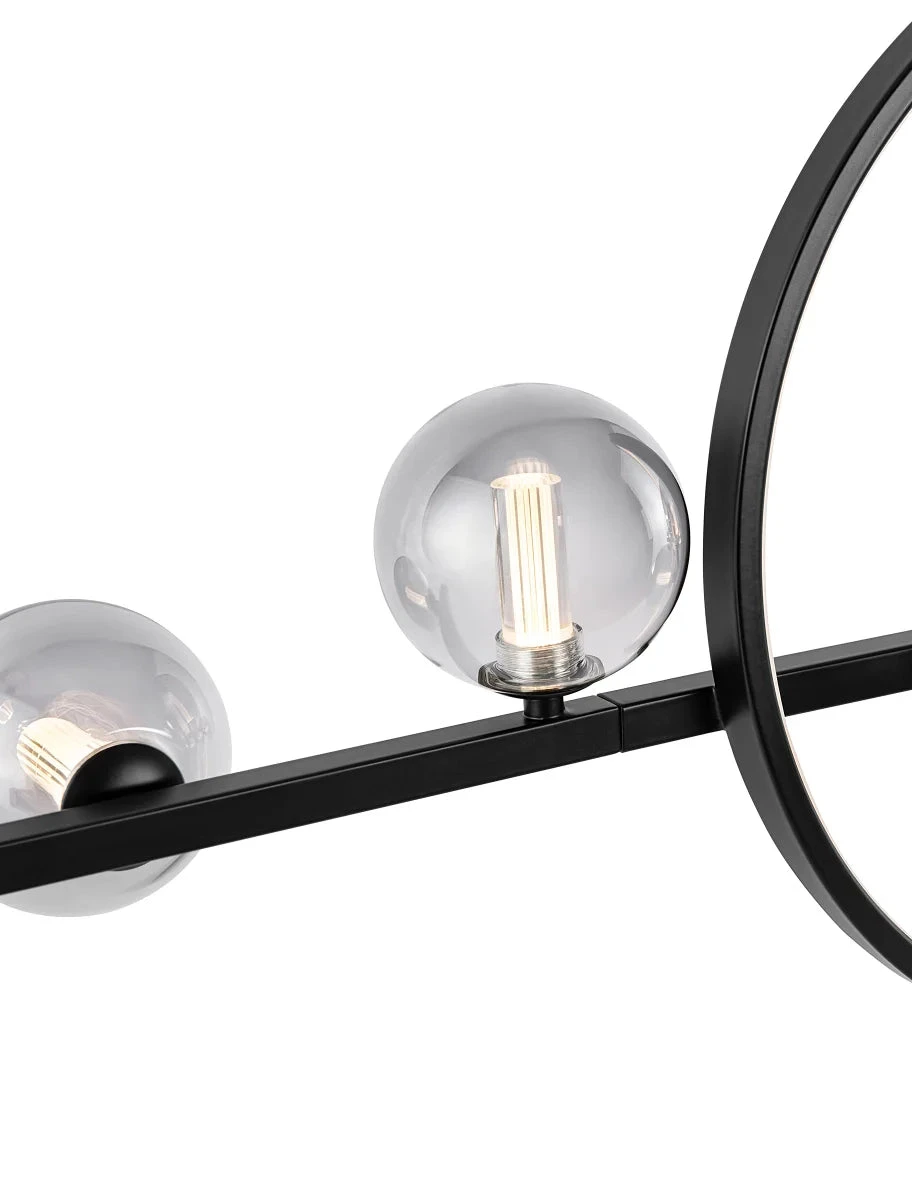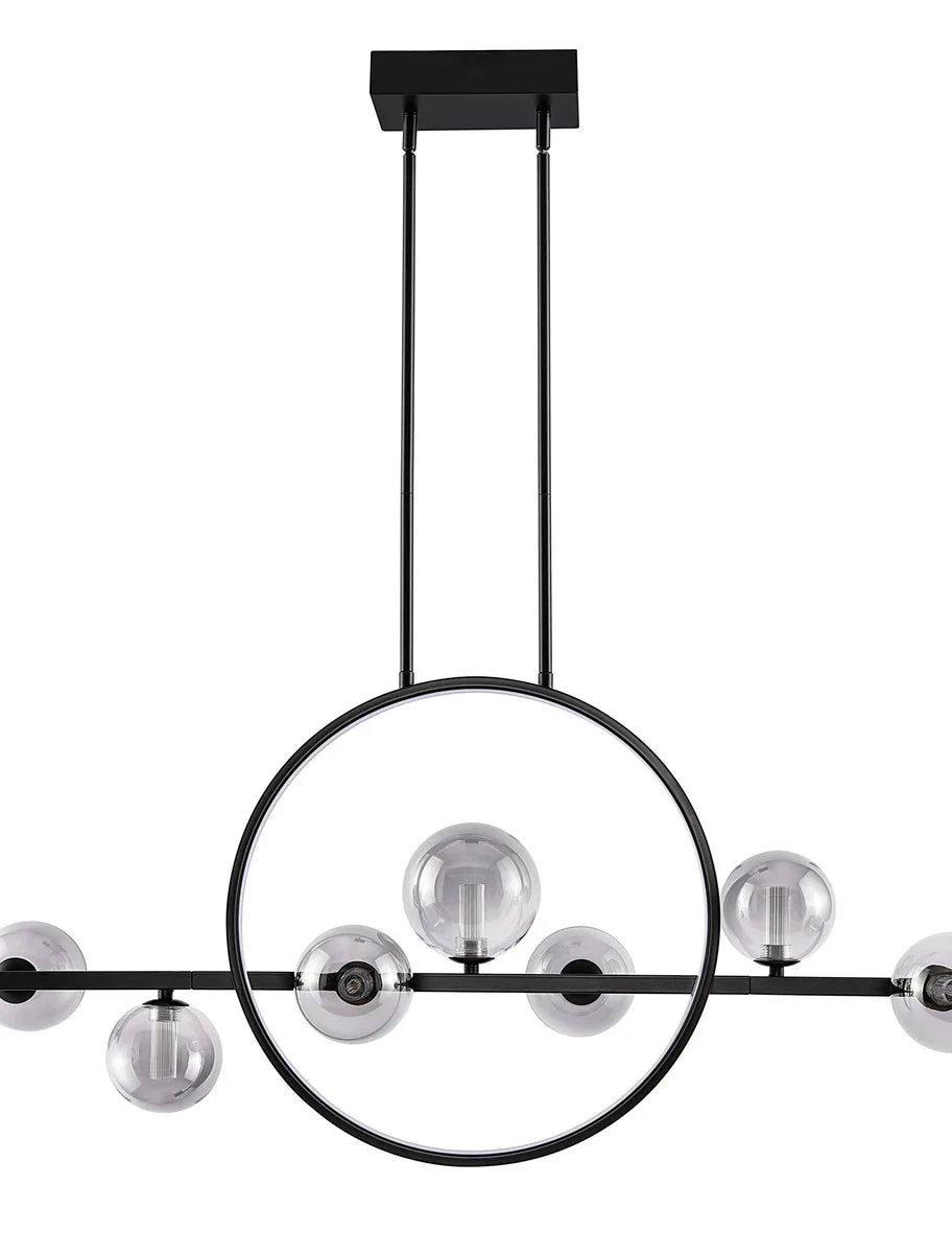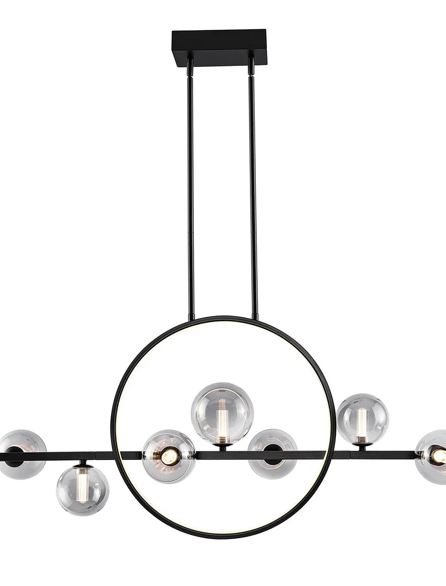 Matte Black Island Pendant with Smoked Glass Shades. A multi-light island pendant with serious allure, the contemporary Luna has eight integrated lights. Edison-style dimmable LED bulbs, smoked glass shades, and thin lines make it ideal for dining rooms and beyond. It is suspended from a thin plate for an extra subtle finish and adjustability. The center ring adds a multi-directional light output through a transparent diffuser.