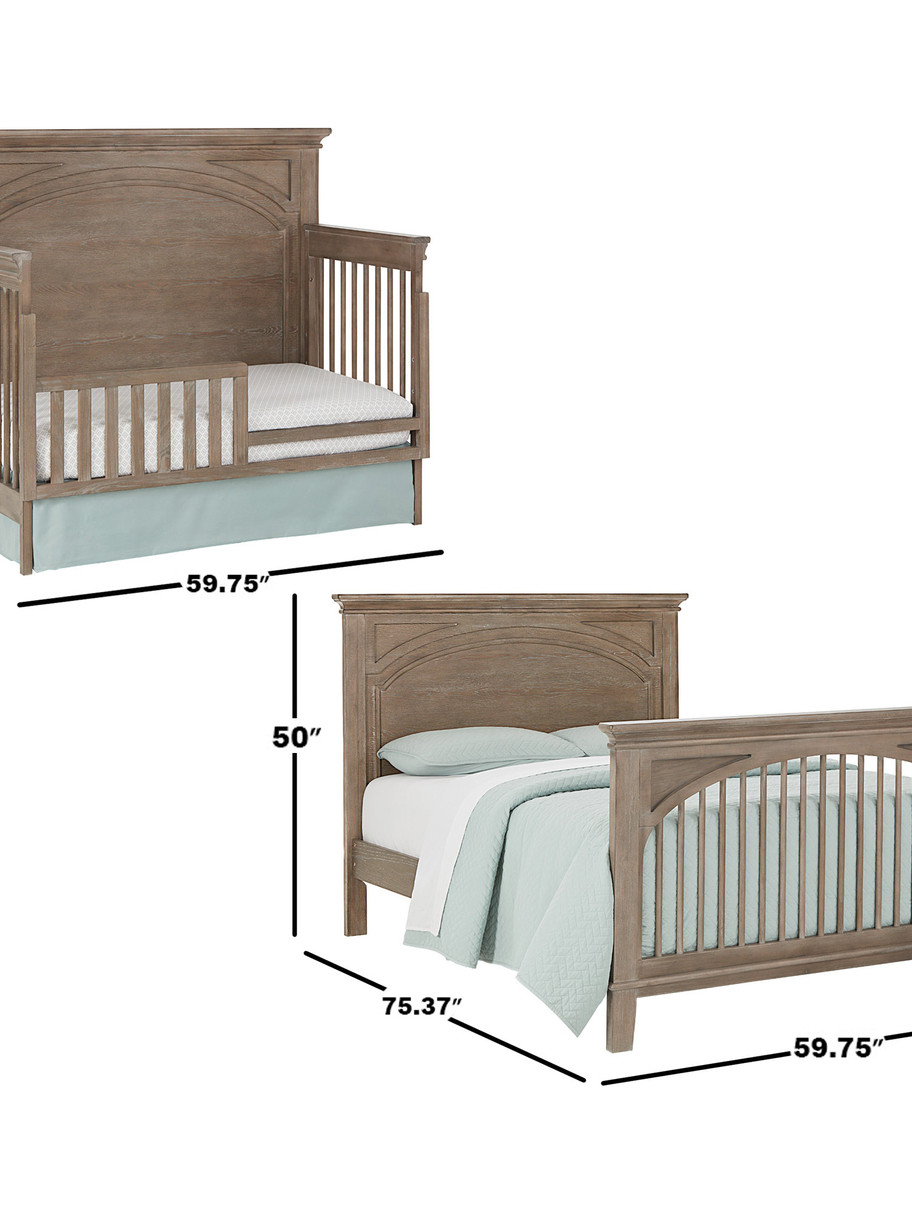 - Converts from crib to toddler bed, daybed, and to full size bed with headboard and footboard (Toddler Guardrail, Daybed Rail, and Full Size Bed Rails included)
