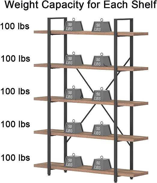 Industrial Wood and Metal 5 Tier Bookshelf, Large Tall Open Rustic Wide Etagere