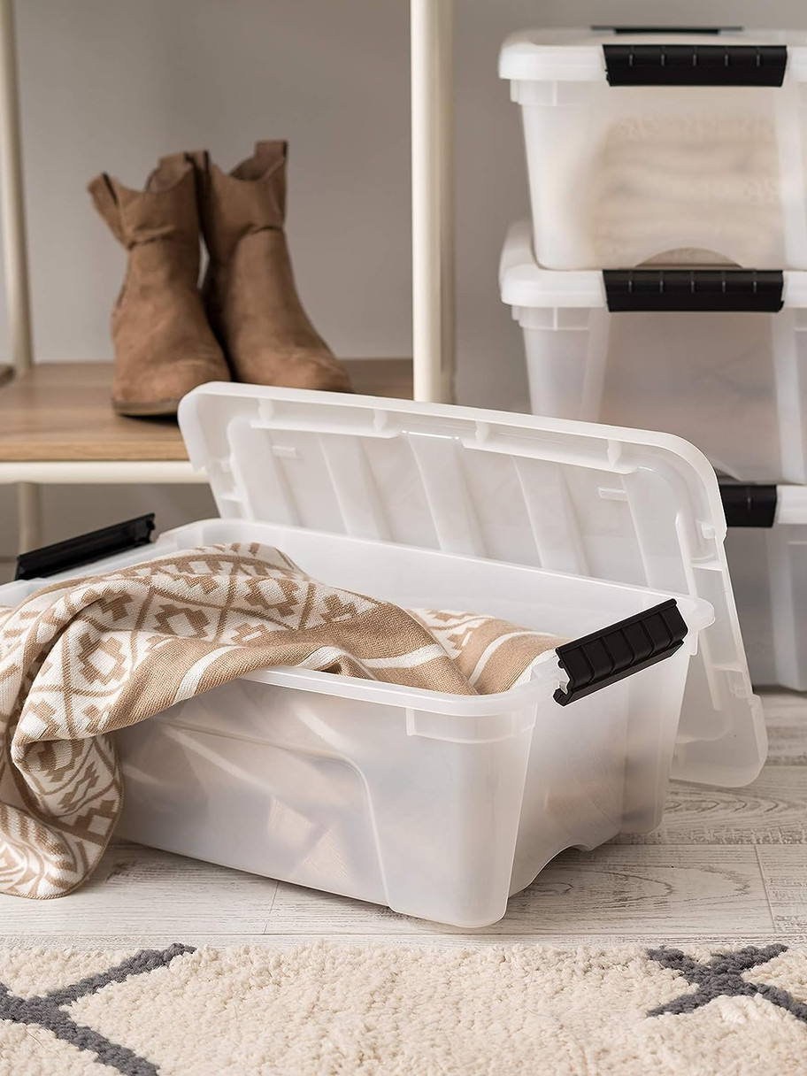 - STYLISH AND DISCREET – The pearl design of our plastic storage bin tote with lid creates privacy. You as a user know exactly what is inside, but also hides it from other people. Also, even if you don’t have space to hide the plastic storage totes in garages, closets and cupboards, no worries. With the new design you can put it in the living room or bedroom, and it will still look stylish.