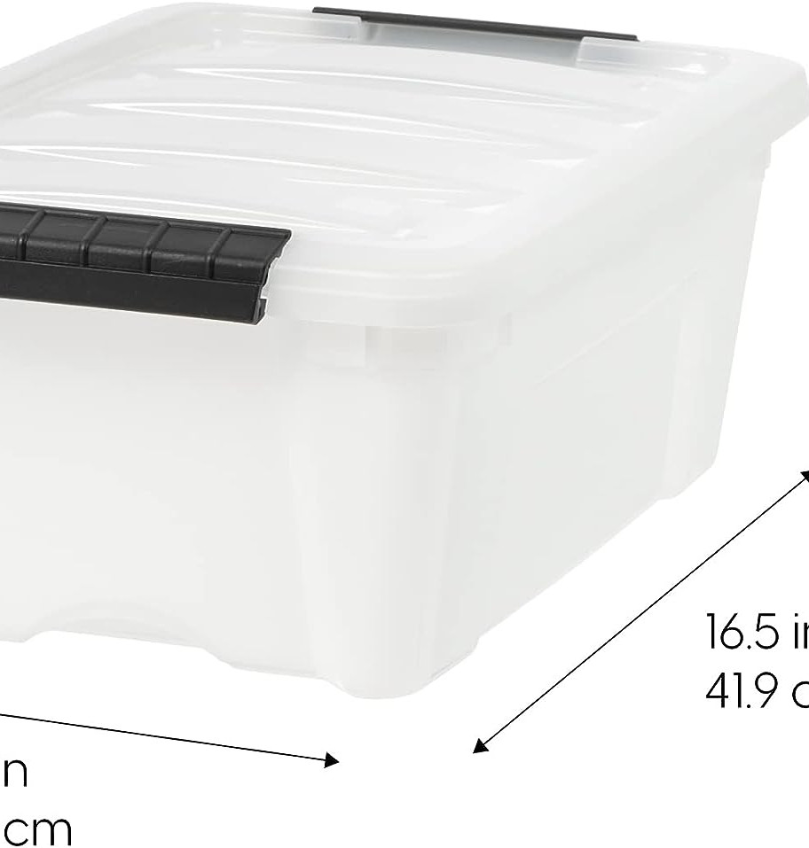 - IRIS USA’s pearl plastic Buckled Lidded Storage Bin Tote is a perfect storage organizer that can fit all your items safely with the anti-break, durable polypropylene material made in the USA