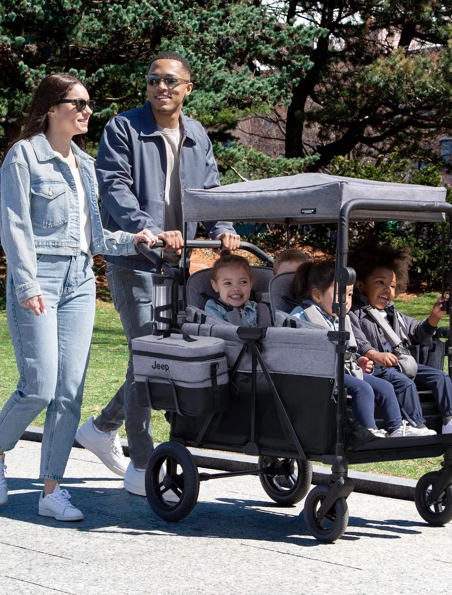 Expand your adventure with the Jeep Wrangler Deluxe Four-Seater Stroller Wagon by Delta Children. Built with everything you love about Jeep Wagons, but with room for four passengers, this XL wagon allows you to bring even more essential cargo. This first-of-its-kind convertible wagon offers a range of seating options to accommodate up to four children—both seats can face forward, backwards, inwards in different directions, or you can remove the seats completely and use the wagon to carry all your gear. This wagon comes with a removable canopy that has roll down mesh screens for ventilation or black out privacy screens for on-the-go naps. Take advantage of the wagon’s expansive storage, with its front and rear storage pockets, a large cooler that can be attached to the front, back or side of the wagon, zippered storage compartments under the seats, kids snack tray, plus two parent cup holders. Two adjustable leatherette handlebars ensure a comfortable grip for parents of all heights, while the large, puncture-proof tires provide a smooth ride on any terrain. The wagon’s flat fold makes it easy to store and transport. It’s the perfect all-in-one solution for any family.