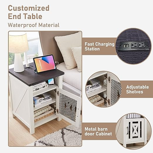 - 【Farmhouse End Table】JXQTLINGMU end table draws inspiration from the farmhouse style with its crisp white and soft black color and boasts a streamlined silhouette combined with a metal mesh barn door making the whole end table chic and aesthetic. Create a comfortable and intoxicating feeling in your living space.This side table is ideal for your living room, bedroom or study.