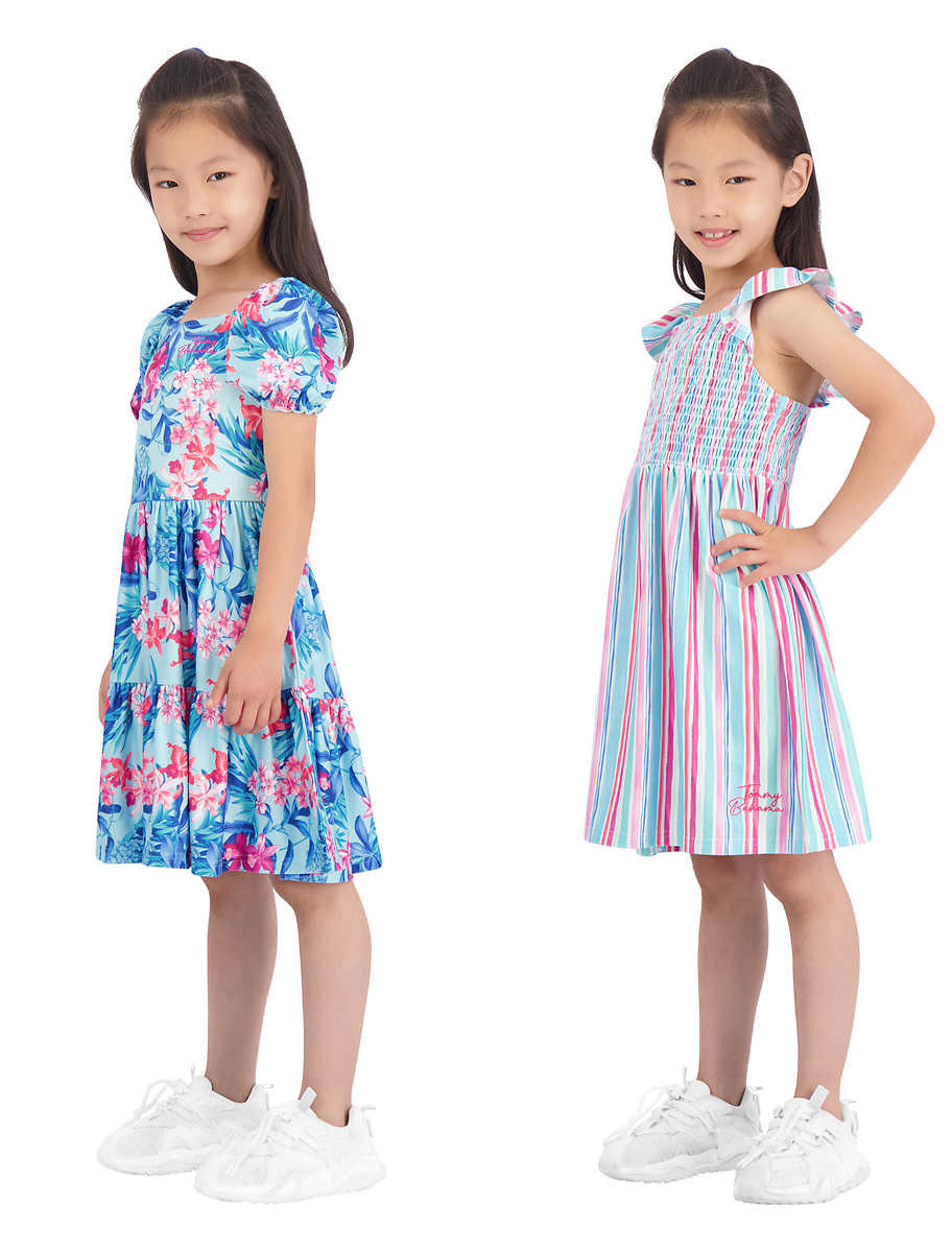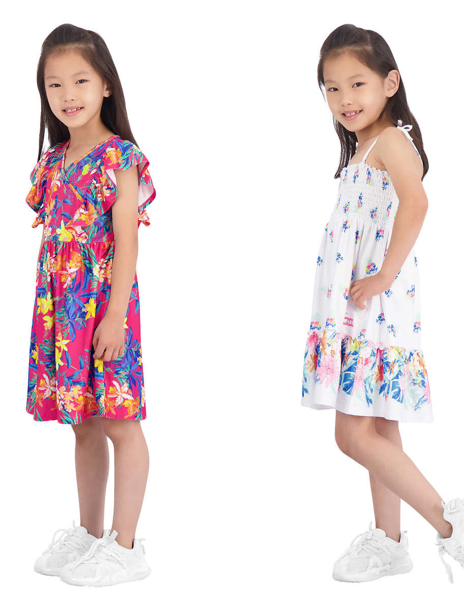 - Pink pack features floral short sleeve dress and string strap dress with decorative bows