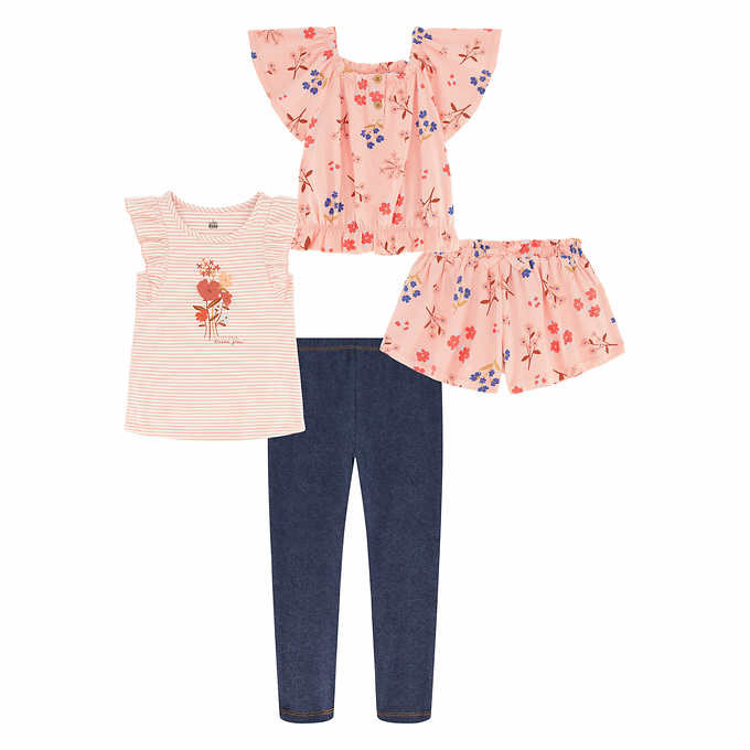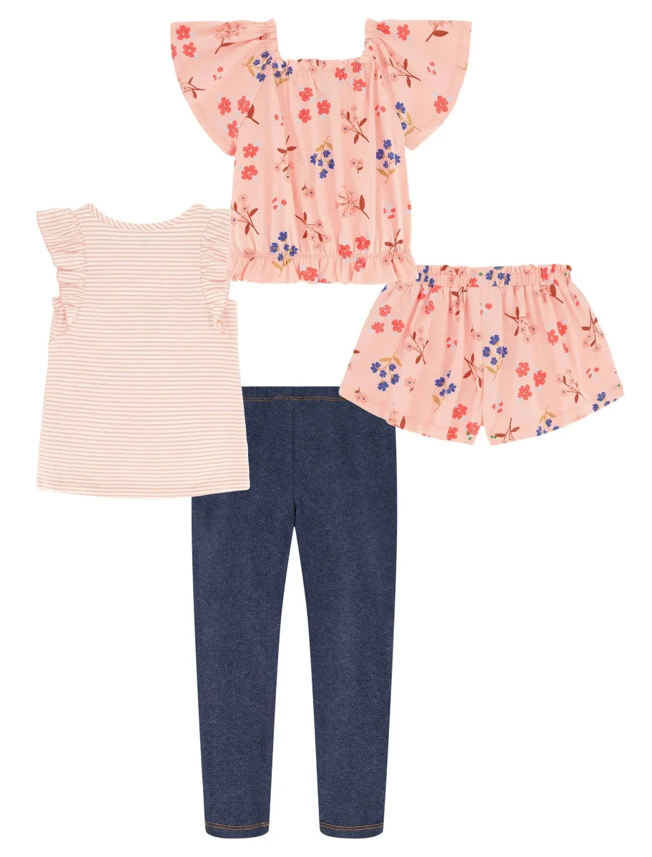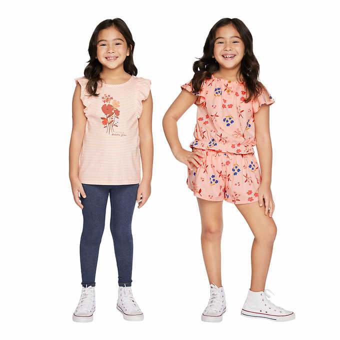- Pink set includes: (2) short sleeve tops, (1) short, (1) legging