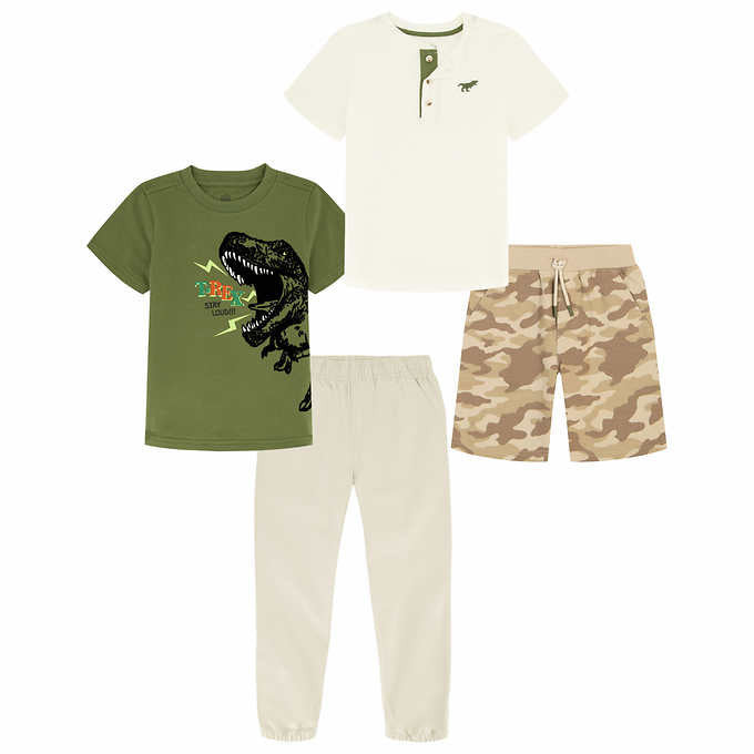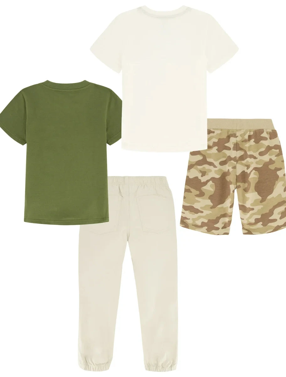 - Green set includes: (2) short sleeve tops, (1) short, (1) jogger