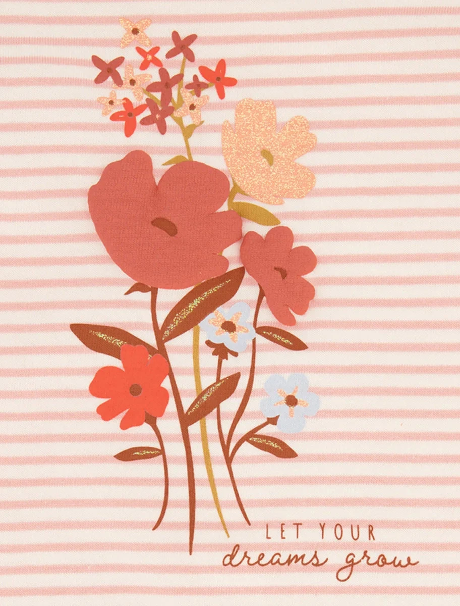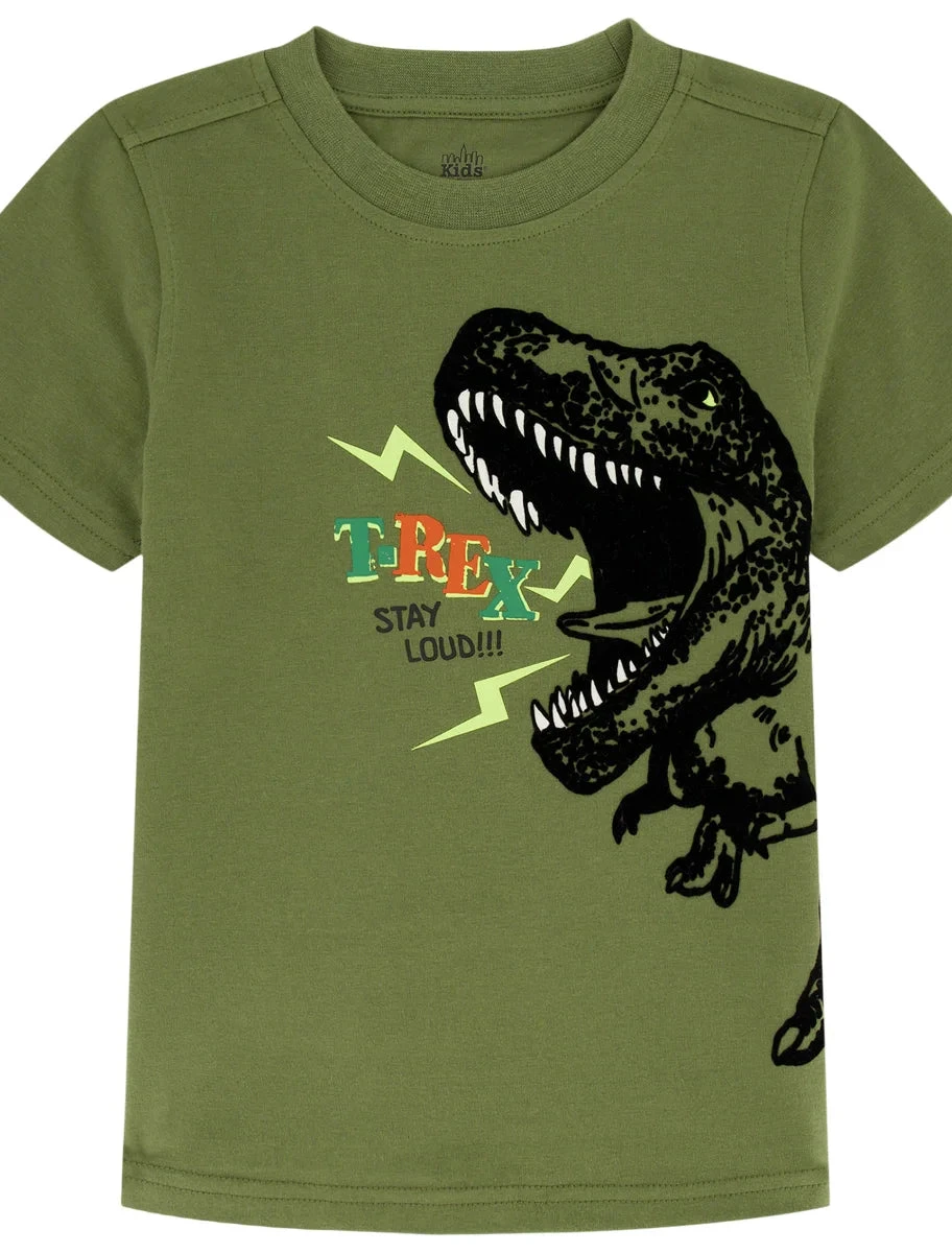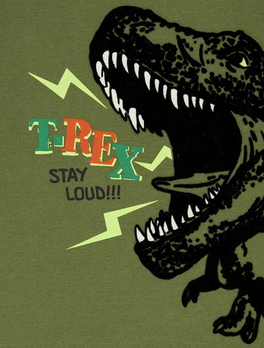 - Colors: Green (Dinosaur), Pink (Flowers)