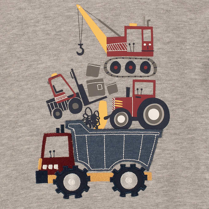 - Gray and red raglan hoodie with construction graphic on chest with ribbed cuffs and waist