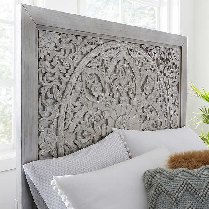 The high headboard is intricately carved with a mandala pattern, a spiritual symbol that is said to establish a sacred space. The carved elements are polyester-formed in molds created from original wooden hand carvings. Crisp edges, delicately curved feet for a clean look. Made from sandblasted Pine solids and veneers to create an organic raised grain texture, and a washed white finish uses a sand-through effect to showcase the wood’s natural texture and grain. The bed does not require the use of a box spring as the rolled slat system is designed for use with just a mattress.