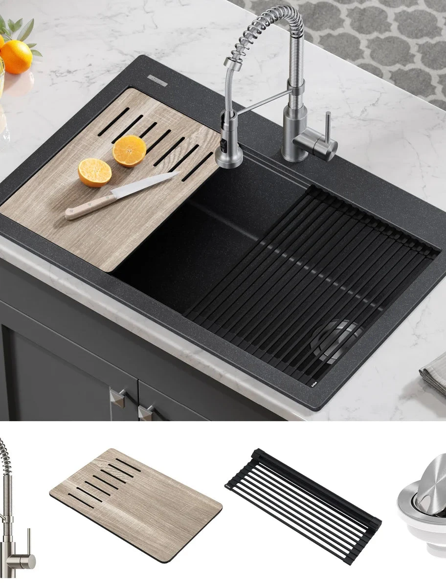 Enjoy the ideal blend of style, quality, and value with the KRAUS Granite Composite Workstation Sink and Kitchen Faucet Combo. Merging the space-saving benefits of a workstation sink with the professional design of a commercial-style faucet, this perfect pairing will enhance the look and functionality of any kitchen. The high-capacity sink is constructed from an advanced granite composite material for the look and feel of real stone. The integrated ledge provides a platform for accessories that slide across the sink to streamline your kitchen workflow. The included roll-up dish drying rack and heavy-duty composite cutting board allow you to prep and clean right over the sink without taking up counter space. A rear-set drain and tight-radius corners create a modern aesthetic and maximize usable workspace. Drop-in installation with an extra-thick mounting deck works with any kind of kitchen counter. A sleek semi-pro faucet completes the combo, with a 2-function pull-down sprayer that switches between aerated stream and spray for maximum flexibility. The compact 18-inch faucet height fits under most cabinets. Spot-Free Stainless Steel Faucet Finish prevents water spots and fingerprints, making maintenance easy.