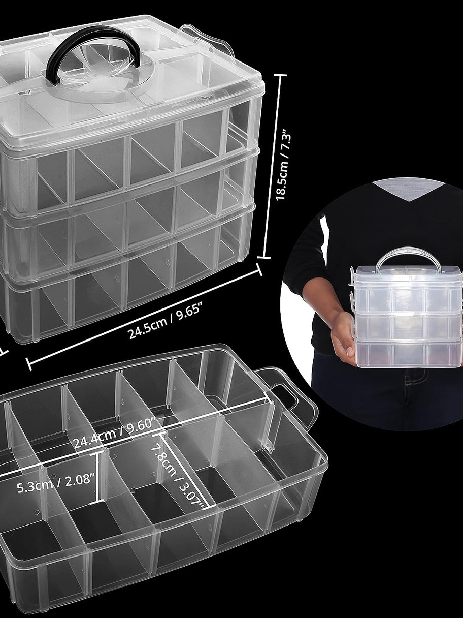 - 3 TIER STACKABLE STORAGE CONTAINER: This tub features three trays that can snaplock together. Each tray can have 1 compartment for a maximum of 10 compartments. When all trays and dividers have been used this storage container boasts up to 30 compartments. Fully assembled it measures: L24.5 x W16.5 x H18.5cm (9.65 x 6.5 x 7.3 inches). Large middle dividers measure: L24.4 x H5.3cm (9.60 x 2.08 inches). Small dividers measure: L7.8 x H5.3cm (3.07 x 2.08 inches).