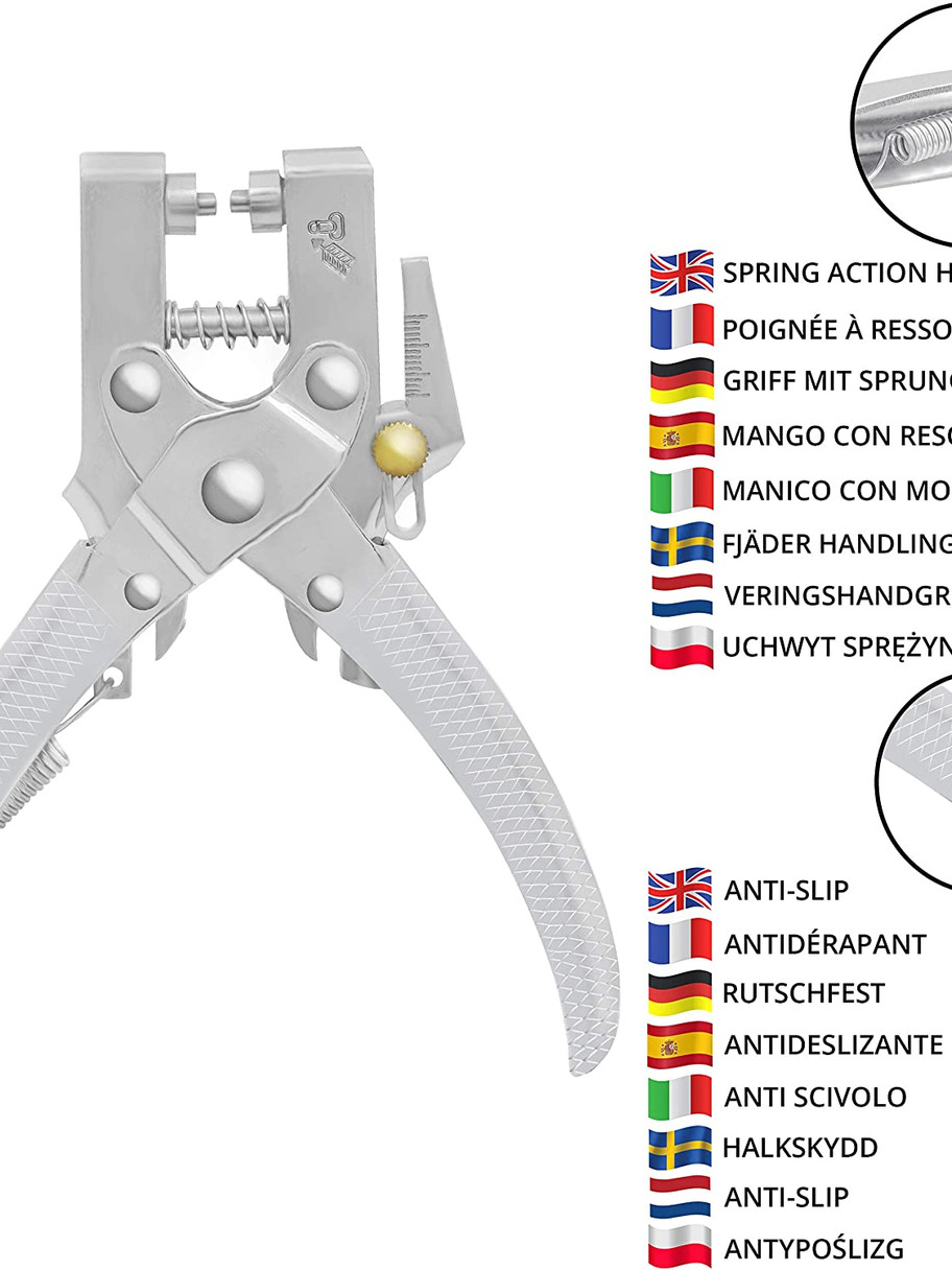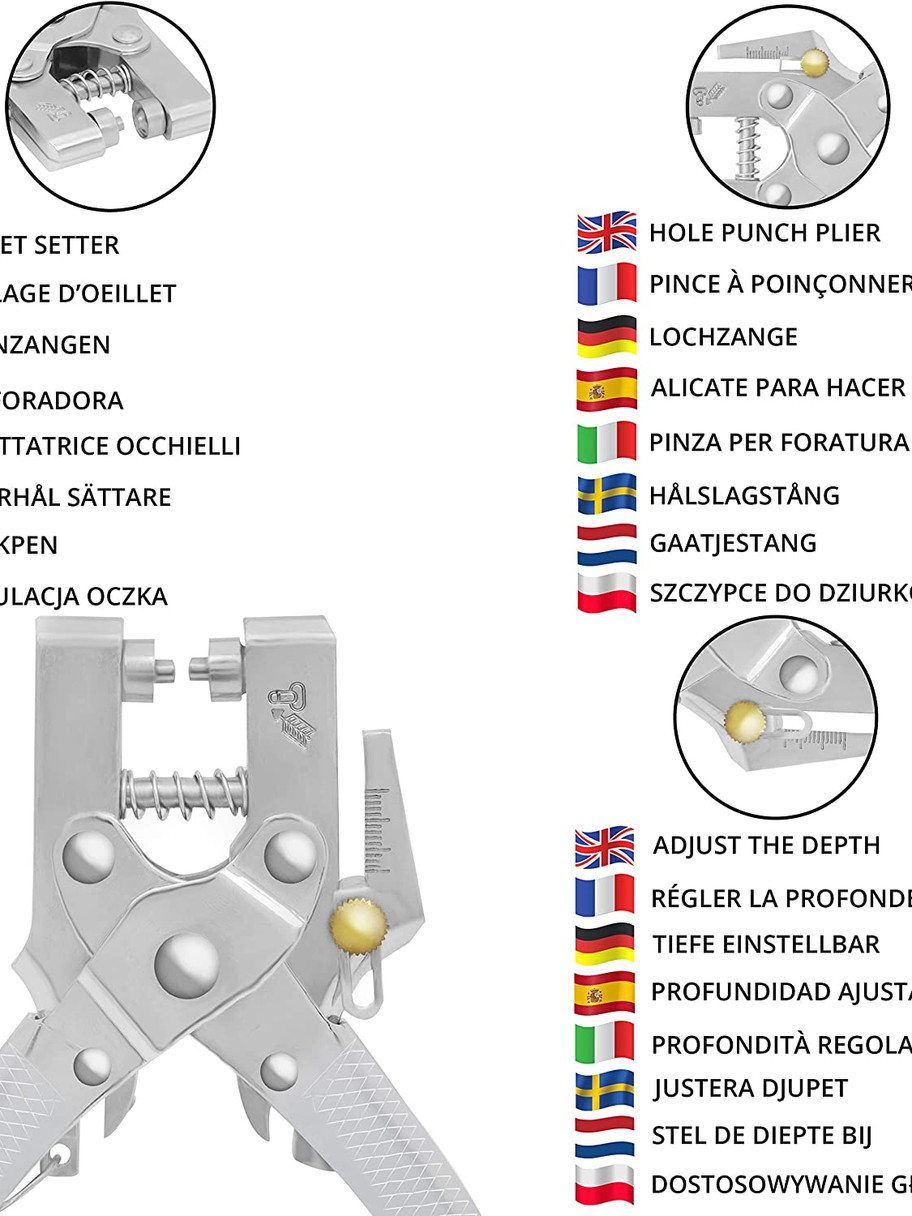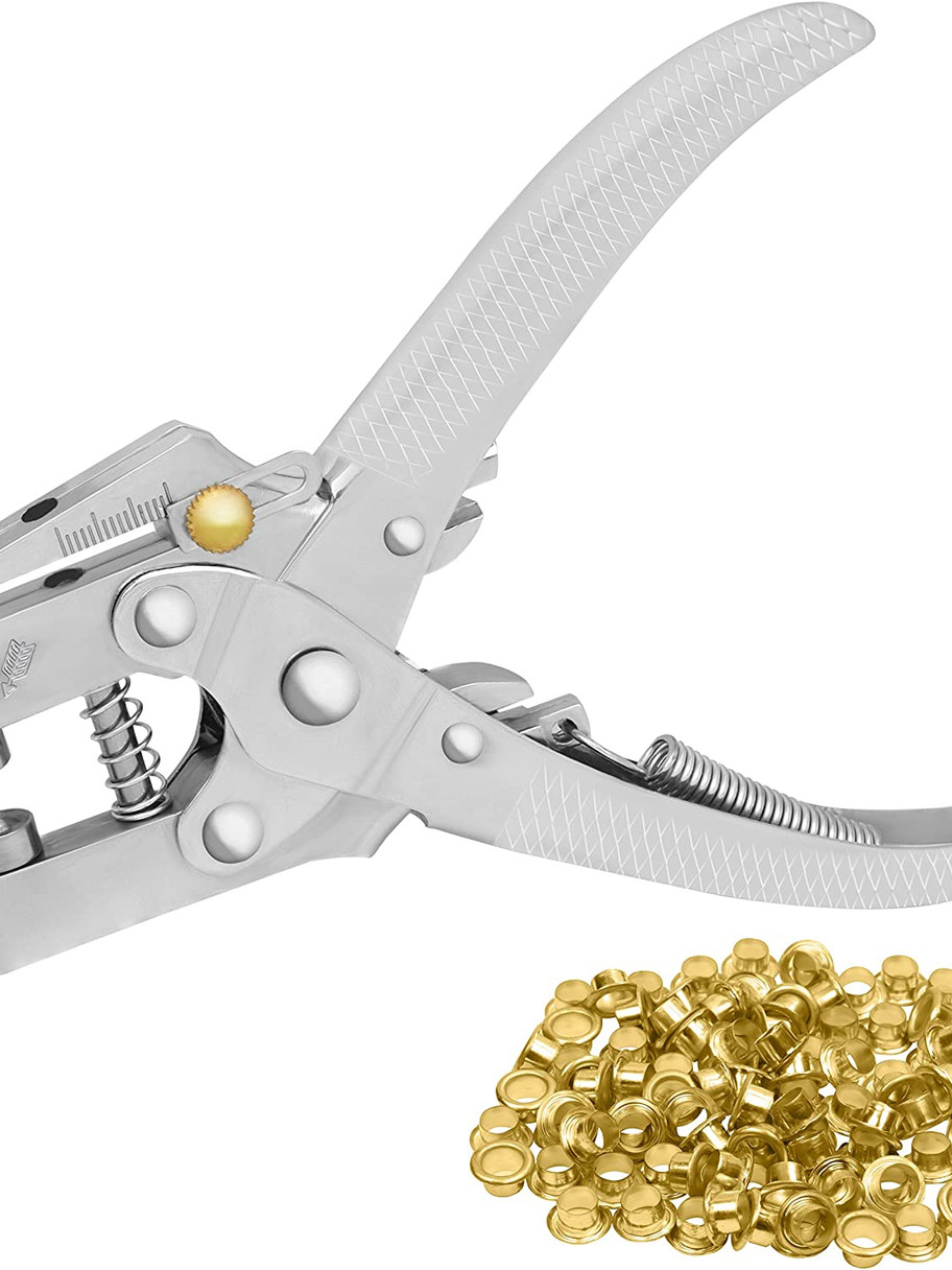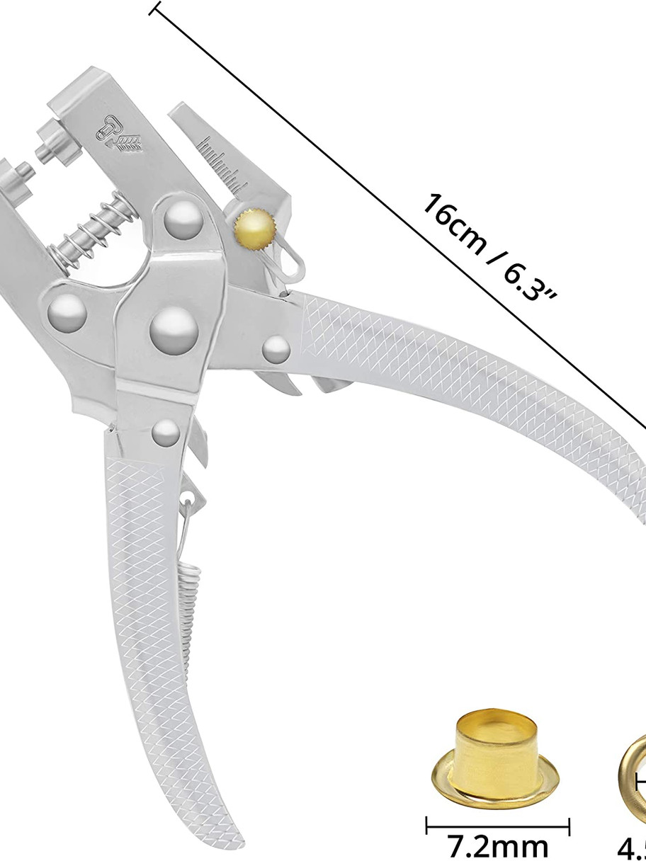 - ADD EYELETS WITH EASE: Line the pliers up with the material where you want the hole to be, then press down on the plier handle to make a small hole. Put the eyelet in place and use the pliers to press the eyelet grommets into the material, which locks the eyelet in place. If the fabric is too thick to make a hole, use a saddlers punch. The pliers have a sliding measuring guide so you can punch your hole at the required depth. Stop fraying and ripping by using eyelets for holes in the material.
