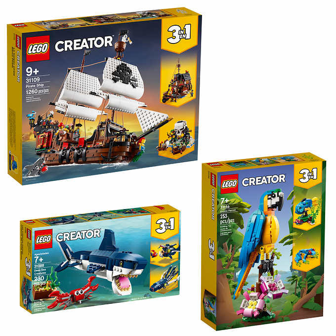 This awesome, detailed set features a pirate ship with moving sails, cannons and a cabin with opening roof and sides, 3 minifigures, buildable figures including a shark and a parrot. Young swashbucklers can push their imaginations with 1 of 3 pirate-themed models: A Pirate Ship, Pirates’ Inn or Skull Island.