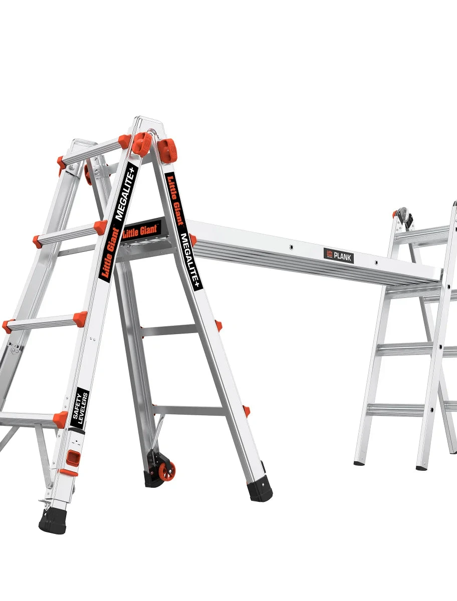 Using a ladder outdoors has always had its challenges, but the Little Giant® Megalite+™ changes that experience. Whether you work on unlevel ground or set up your ladder on a staircase, the Megalite+ can handle it. Meeting or exceeding all OSHA and ANSI standards, the Megalite+ is rated to hold 300 lbs. in all configurations; and in A-frame, it will hold 300 lbs. on both sides. Uneven terrain? Not a problem. With the Safety™ leg levelers, you can adjust the ladder’s legs in seconds, allowing you to stabilize the ladder on unlevel ground. The retractable legs yield more than 7 inches of leveling adjustment. The Megalite+ is the ladder that helps you complete any given task with ease. Set up the ladder in different configurations that suit the project at hand, like A-frame, extension, staircase, 90-degree or trestle-and-plank scaffolding. It’s fast and easy.