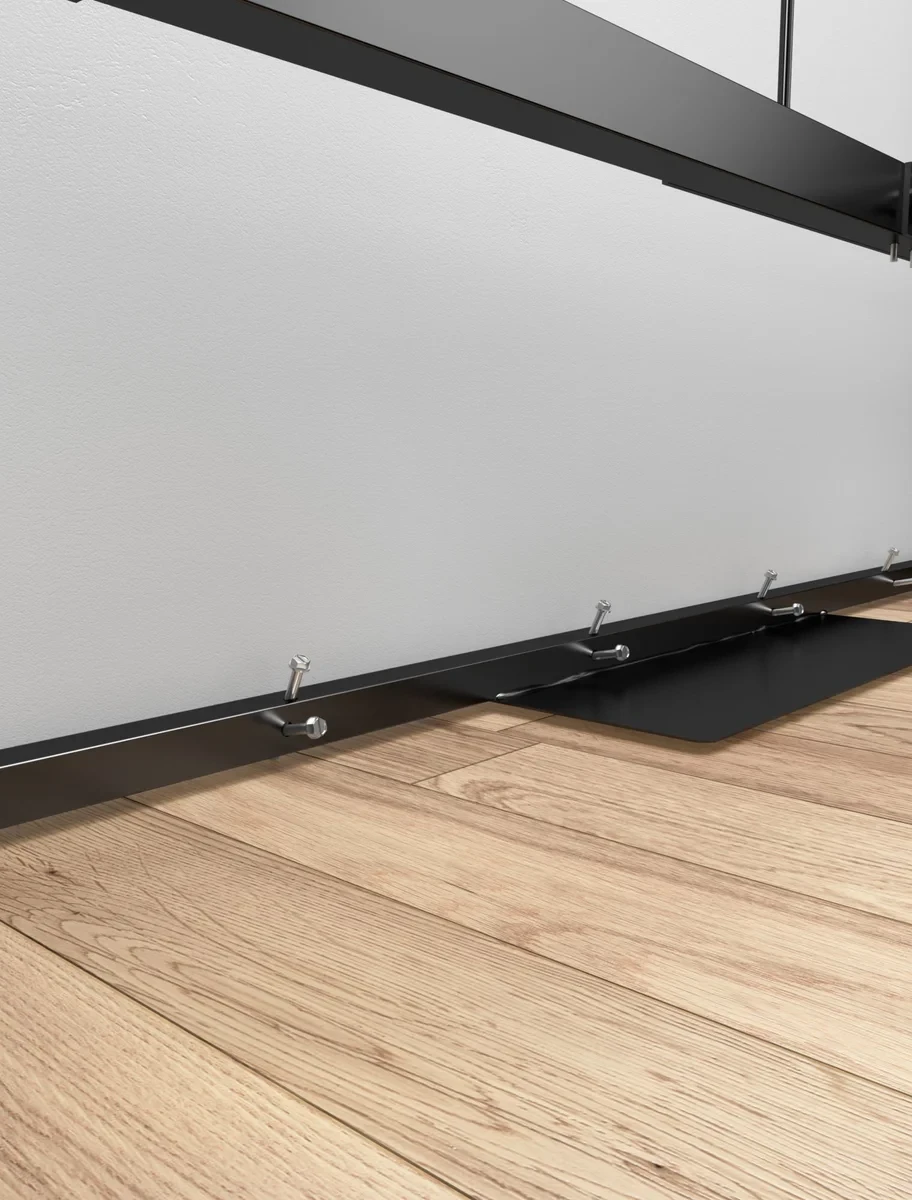- Installation requires attachment to wood studs or masonry, removal of the baseboard, and drilling into the floor (if disassembly is required, holes may be covered with baseboards 0.5 in. or thicker); all necessary hardware is included