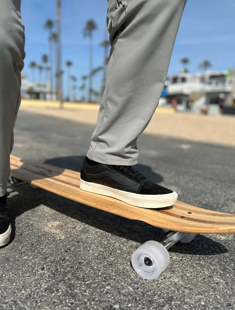 In order to be as comfortable as possible for a beginner, a deck should be stiff and stable. We used 5 thick plys of maple between the bamboo veneer to do just that. The deck is stiff and the trucks and wheels are soft for easy cruising.