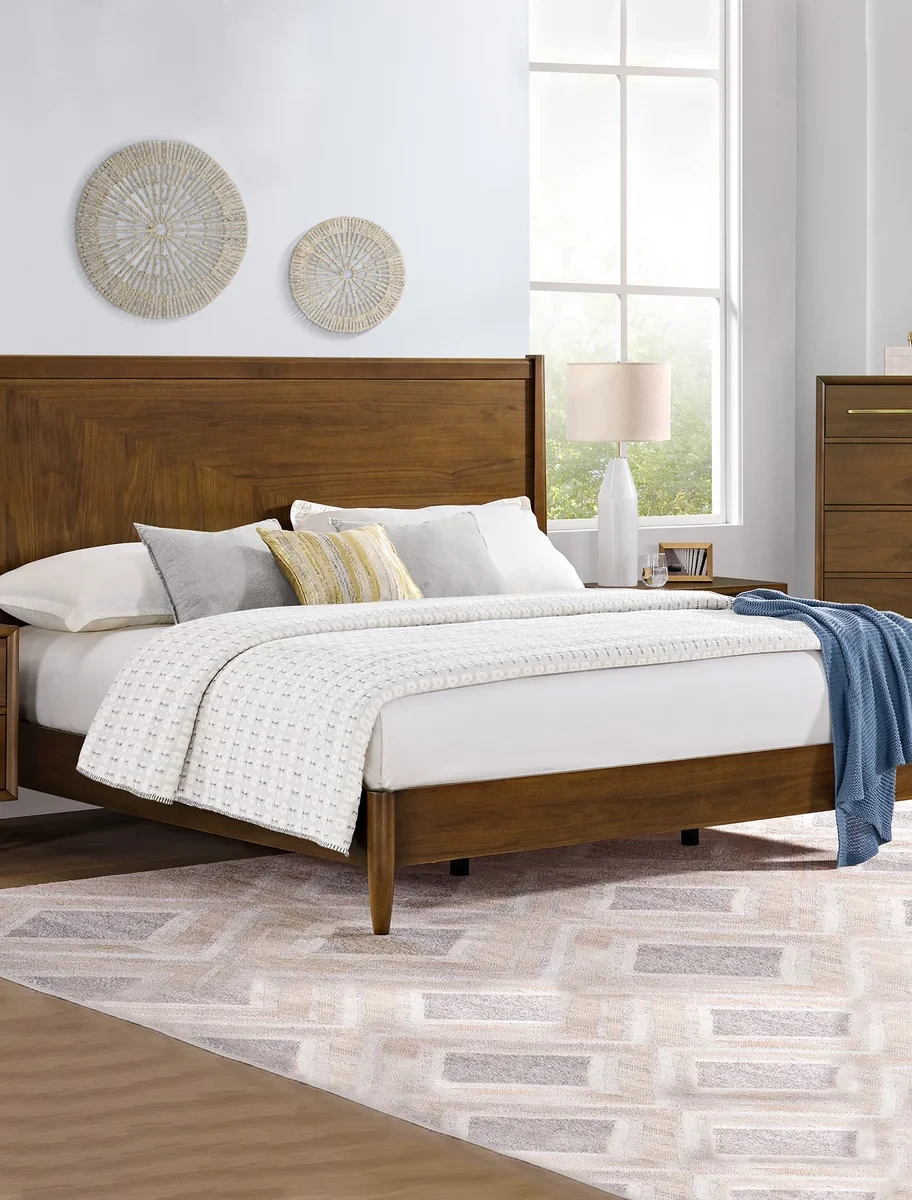 The Marina Del Rey Bedroom Collection features all the quintessential features of this ever-popular design aesthetic. Constructed of hardwood solids and walnut veneers, this bed features a unique split veneer pattern on the panel headboard and cylinder tapered legs that are the signature mark of mid-century design. Heavy-duty deck boards support your mattress without the need of a box spring – showing off even more of the striking headboard design. Marina Del Ray adds sophisticated funk to your bedroom.