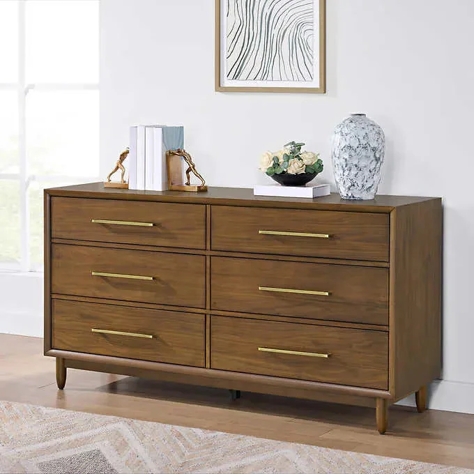 The Marina Del Ray Dresser features a modern silhouette, accentuated by clean lines and a medium brown finish. It's constructed of a solid Alder frame, Oak veneers and engineered wood. Four tapered legs with adjustable levelers offer sturdy support, while the seven drawers feature ample space for your wardrobe. The brass drawer pulls finish off the look with a modern style. This unique combination will add the perfect blend of simple sophistication and warmth to your bedroom.