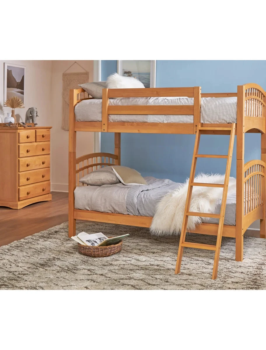The McKenzie Collection is designed with contemporary flair and versatility in mind. The set features double arched styling cues with open and round spindled headboards for timeless appeal. The robust hardwood Beech construction on the bed and case pieces ensures a lifetime of beautiful and practical enjoyment and time-honored craftsmanship ensures truly heirloom quality. The McKenzie bunk bed can also be separated into side-by-side twin beds if desired.