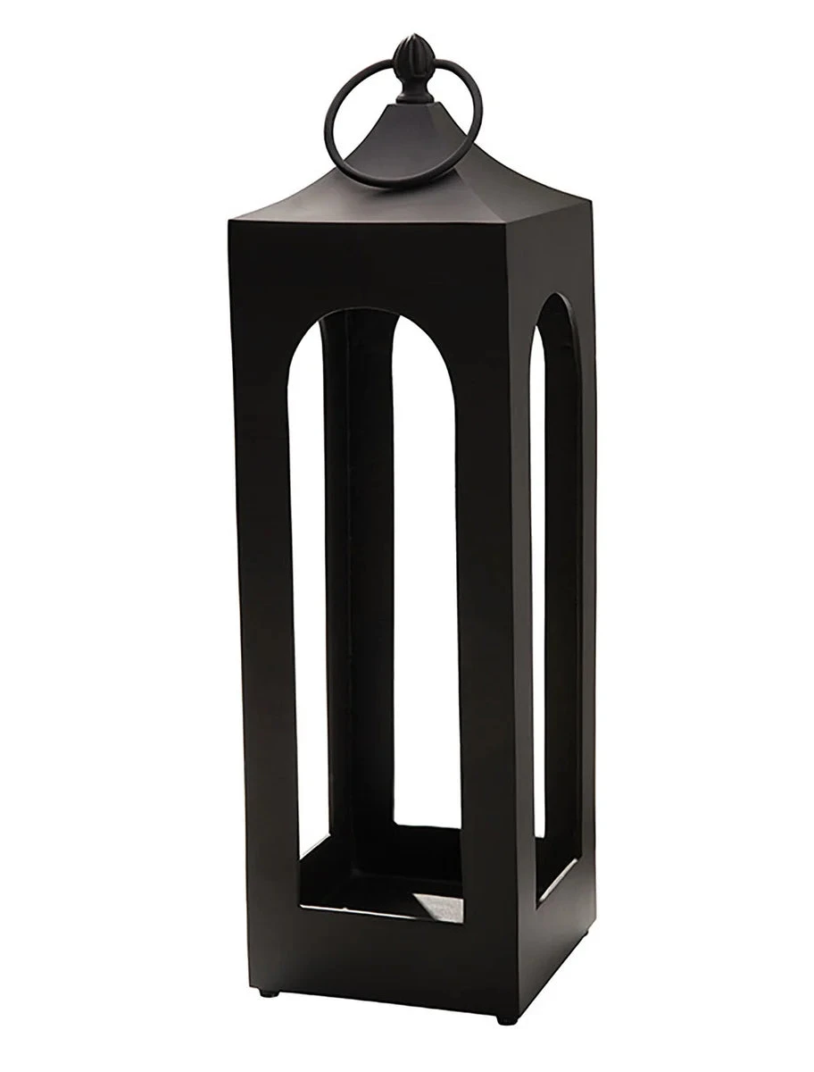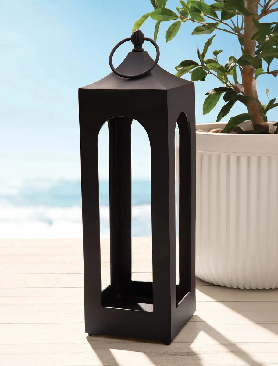 This cast aluminum garden lantern’s versatile and simplistic design effortlessly blends with a variety of lighting and decor themes. Suitable for both outdoor and indoor spaces such as: patios, porches, pathways, and tables. This metal garden lantern features a movable hanging ring for easy suspension, or it can be placed on any flat surface. LED or Wax candles can be used, but are not included. Measuring 28.4 in tall, this lantern is certain to enhance any surrounding area.