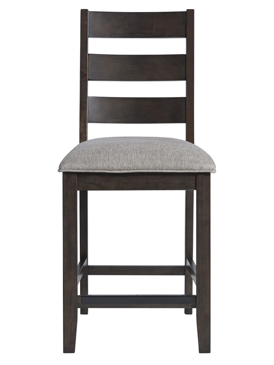 - Ladder-back stools upholstered in a light Gray polyester blend