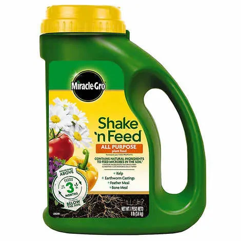 Miracle-Gro Shake 'n Feed All Purpose Plant Food contains natural ingredients to feed microbes in the soil. Microbes break down natural ingredients into nutrients that support root strength and development which increases water efficiency. It contains vital micronutrients to grow stronger, vibrant and more productive plants, versus unfed plants