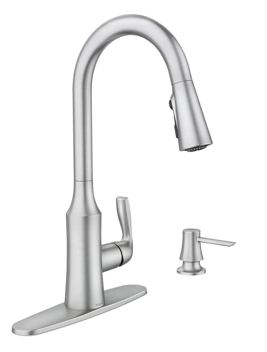 The Cadia™ pulldown kitchen faucet offers a sleek, contemporary design while the high-arc spout and pulldown wand provide helpful functionality for easy everyday use. The faucet features Moen’s PowerBoost™ technology, which provides a faster clean and a faster fill with the push of a button, as well as the Reflex® system to ensure smooth operation and secure docking of the spray wand. Cadia kitchen faucets mount with or without a deck plate and come with a matching soap dispenser for added convenience. Available in Moen’s exclusive Spot Resist™ Stainless finish, which resists fingerprints and water spots to maintain the fixture’s brilliance and minimize cleaning time.